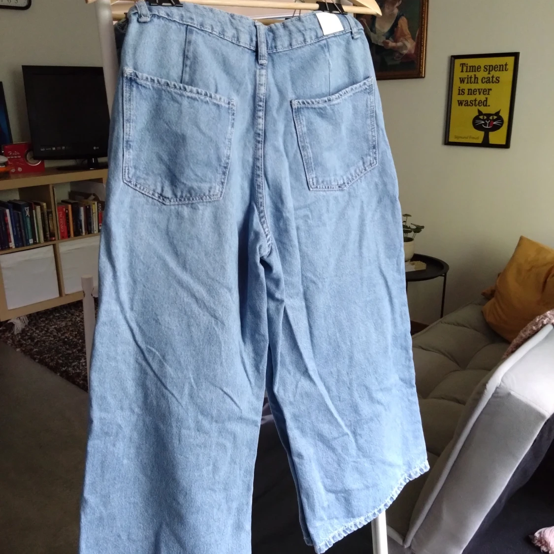 Högmidjade byxor där de är breda i benen med en kortare byxlängd, "cropped". Byxor säljes i gott skick.