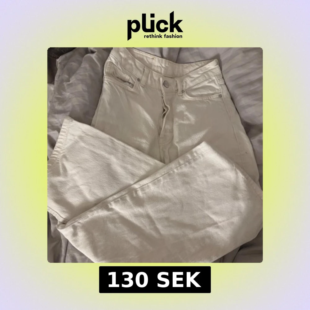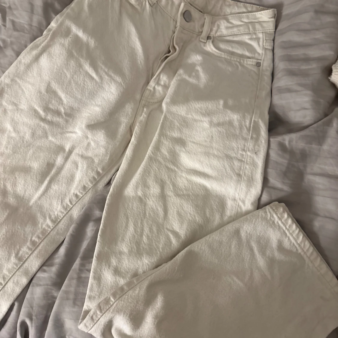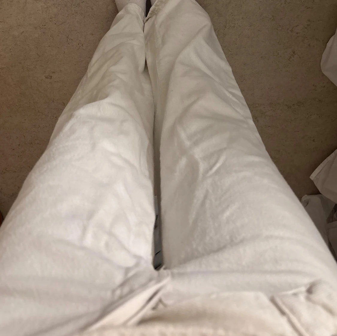Säljer ett par vita mid waist jeans med raka ben och klassisk femficksdesign. Byxorna har hög midja och stängs med knapp och dragkedja. Perfekta för dig som vill ha en clean och stilren look.