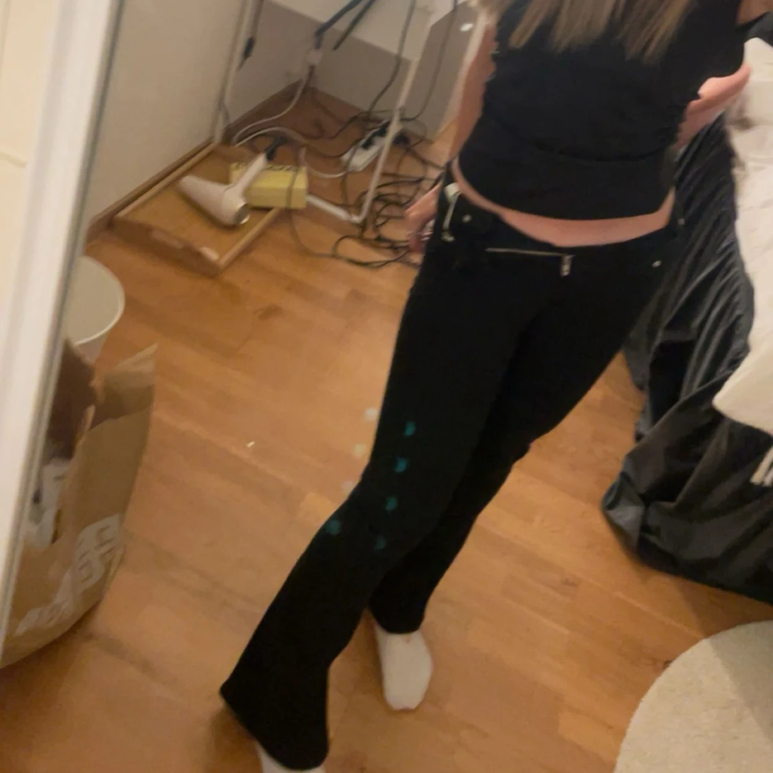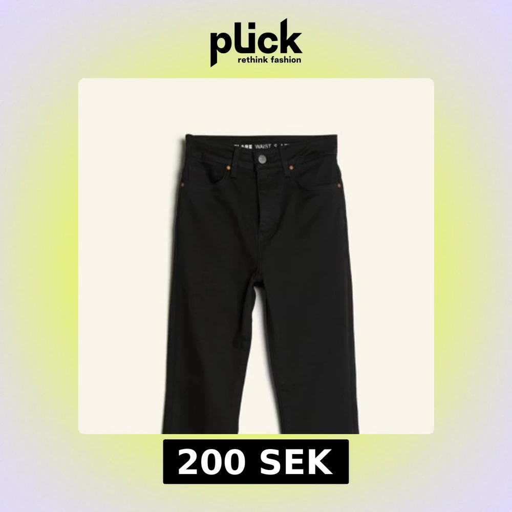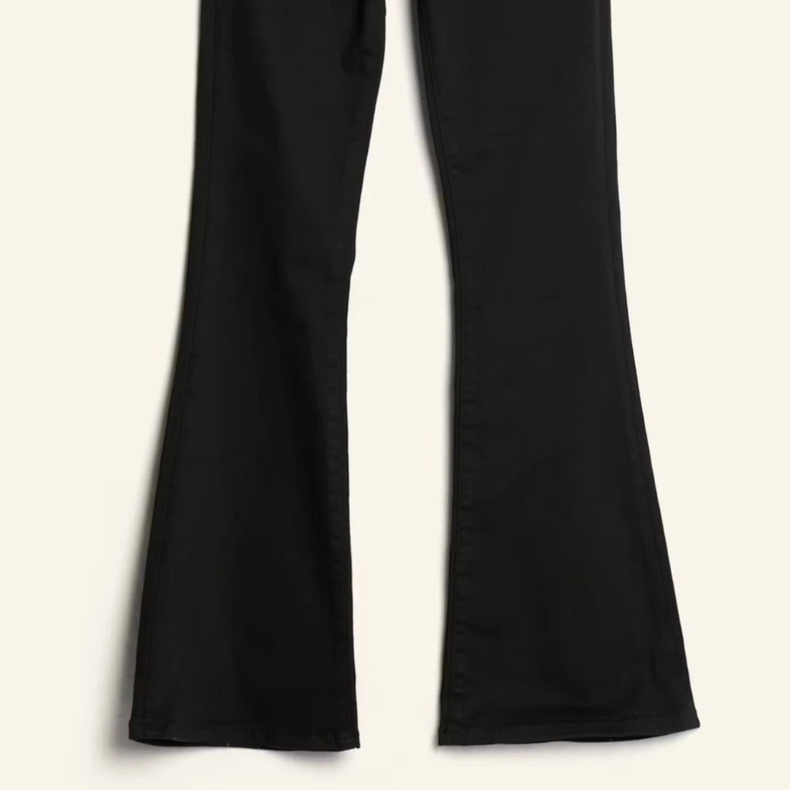 Säljer ett par svarta bootcut-byxor med hög midja. Snygg passform som sitter tajt upptill och släpper ut vid benen. Det går utmärkt att vika dom som jag gjort på bilden