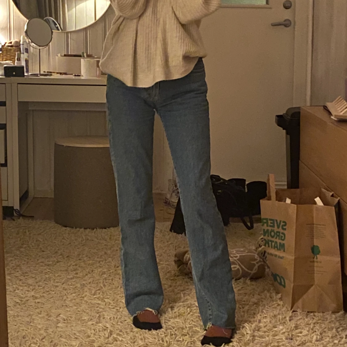 Dessa jeans är i storlek 24 i modellen ”low straight” från Bik Bok. De är i väldigt bra skick och orginalpris är 599kr. Jag har klippt jeansen för att passa min längd, ca 161 cm🥰
