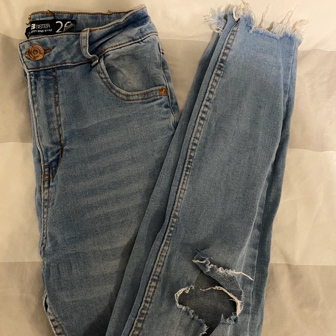 ljusblåa skinnyjeans med hål i knäna och slitningar längst ner