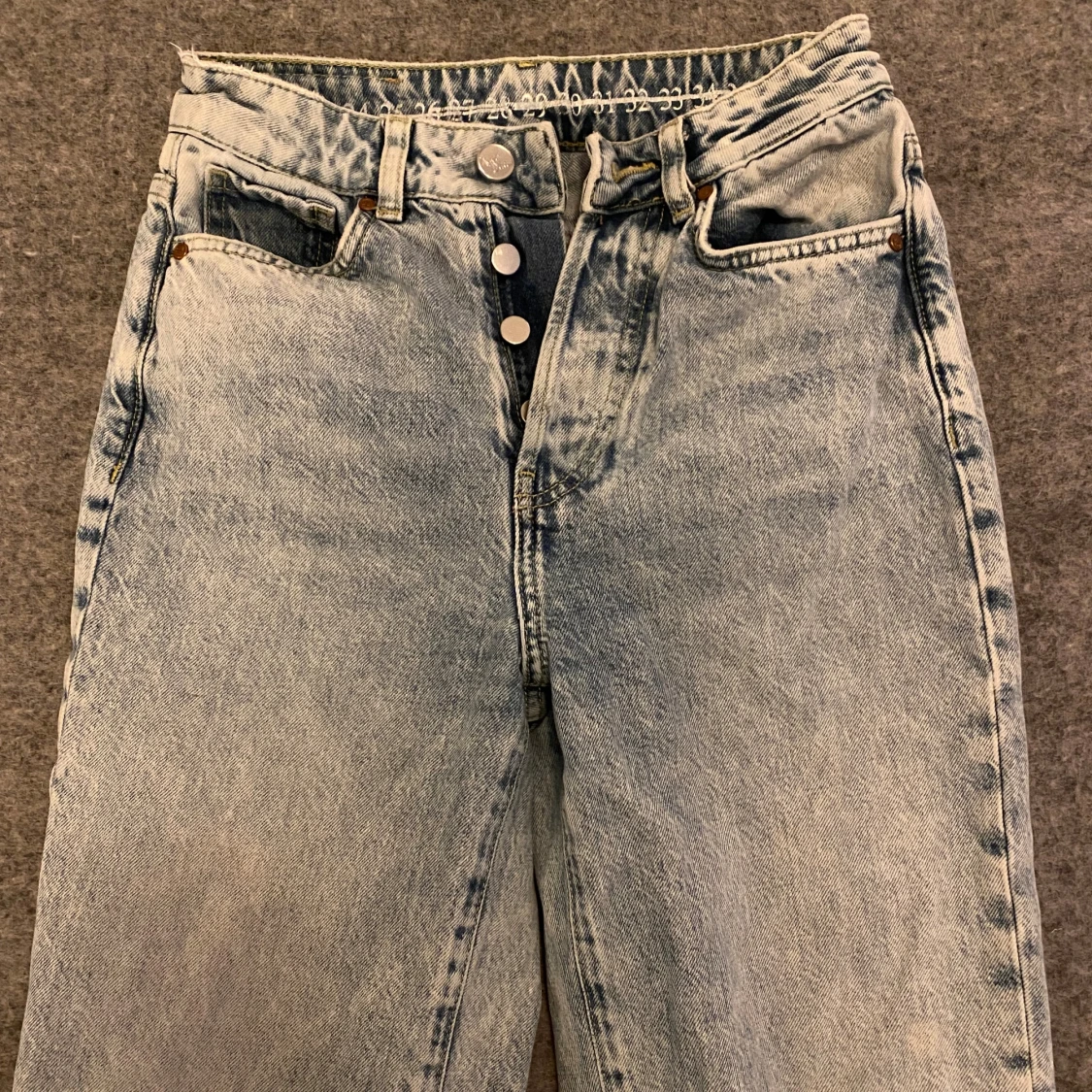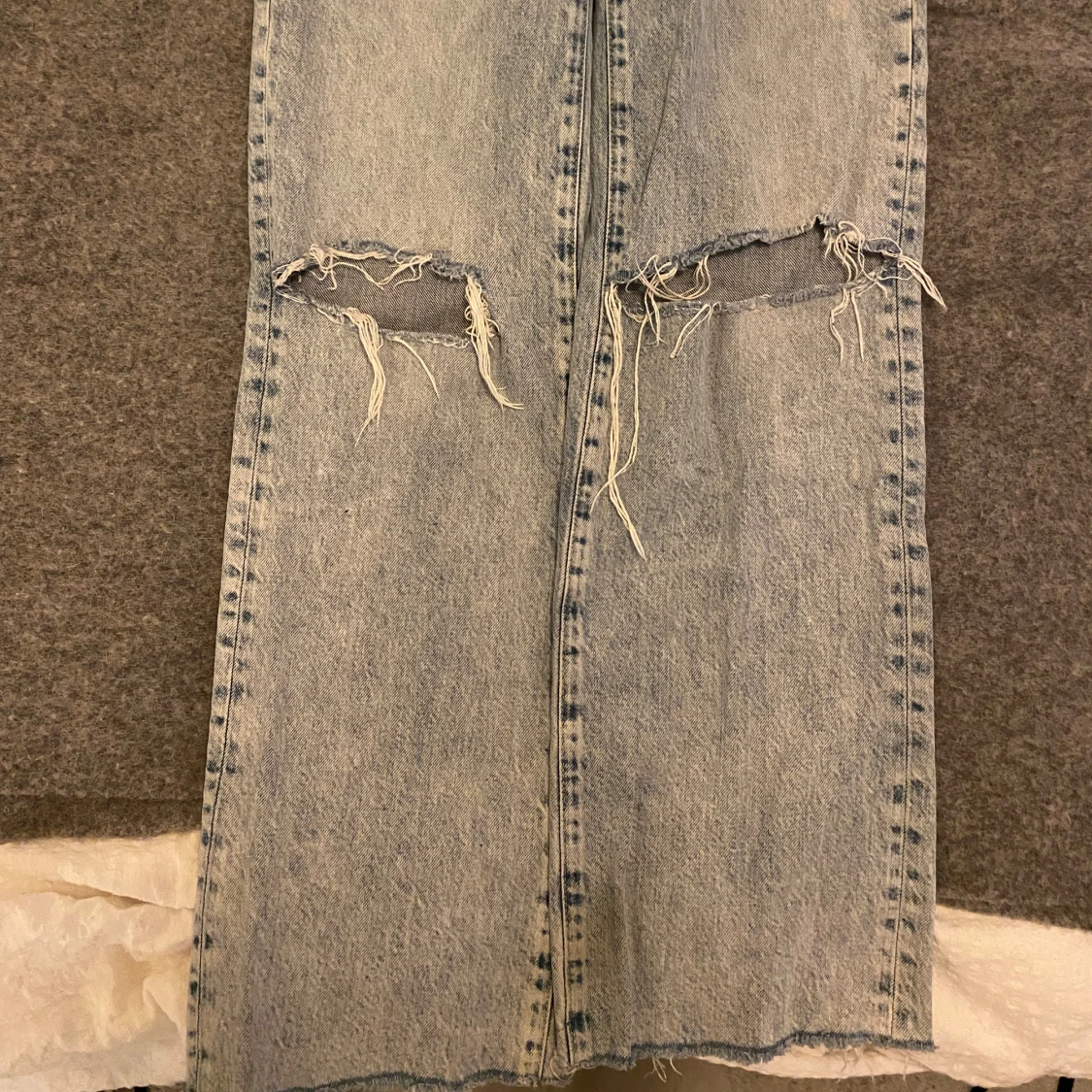 Ljusblåa jeans från Bilbok med hög midja och raka, vida ben. Jeansen har slitna detaljer och hål vid vid knäna. Jeansen har använts mycket men inte påverkats i kvaliten, har också en liten fläck nere vid ena benet på baksidan. Är 163 och byxorna passar, skulle säga att byxorna passar en xs/s