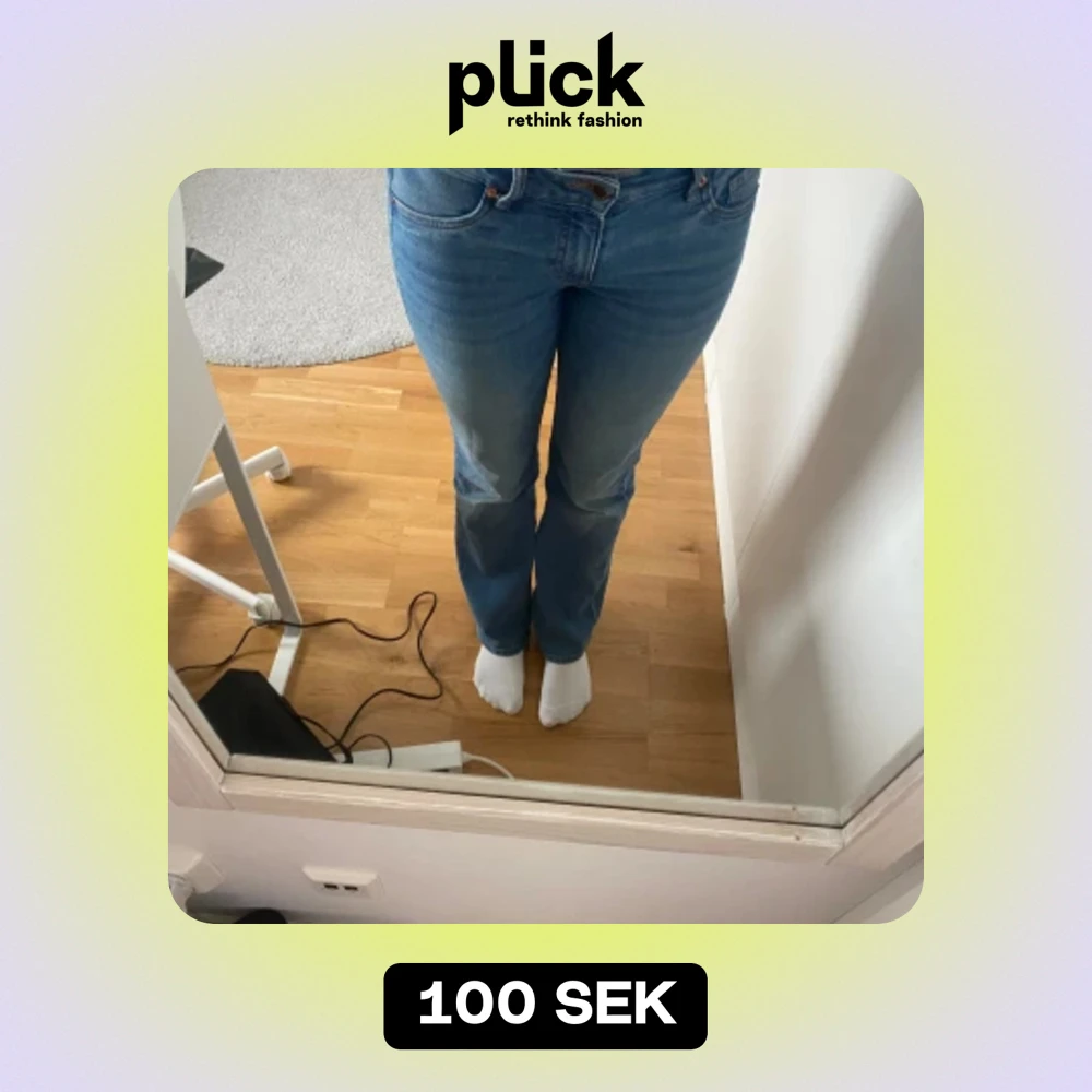 Jeansen är i bra skick förutom slitaget mellan benen. De inringat i rött går ej att se igenom, de inringat i svart går att se igenom men syns inte när man sitter vanligt eller står/går. Byxornas mått-innerbensläng:80cm Midjemått:34cm Skriv vid frågor