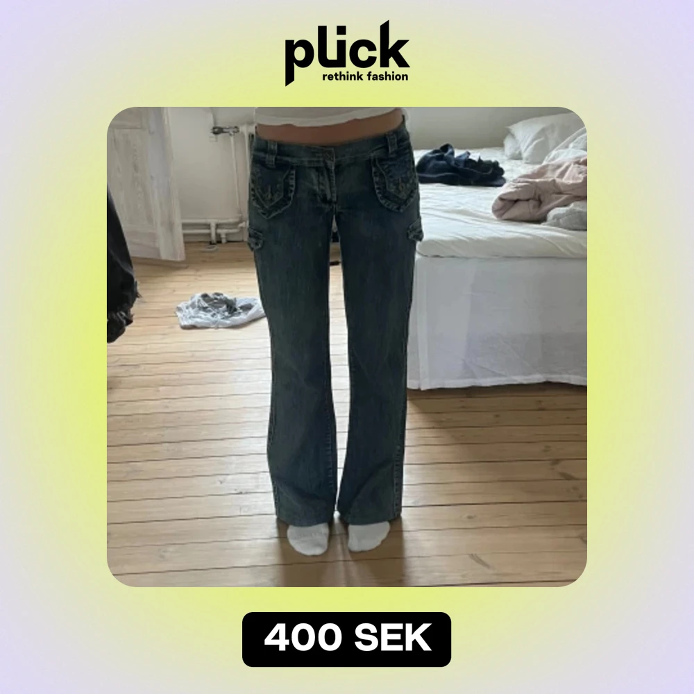 Lågmidjade jeans med så snygga detaljer o utsvängda nertill! Storlek 11/12 på byxan på prislappen storlek 34, men jag har oftast storlek S på jeans och de passar toppen för lågmidjat! Jag är 168 cm 🌸