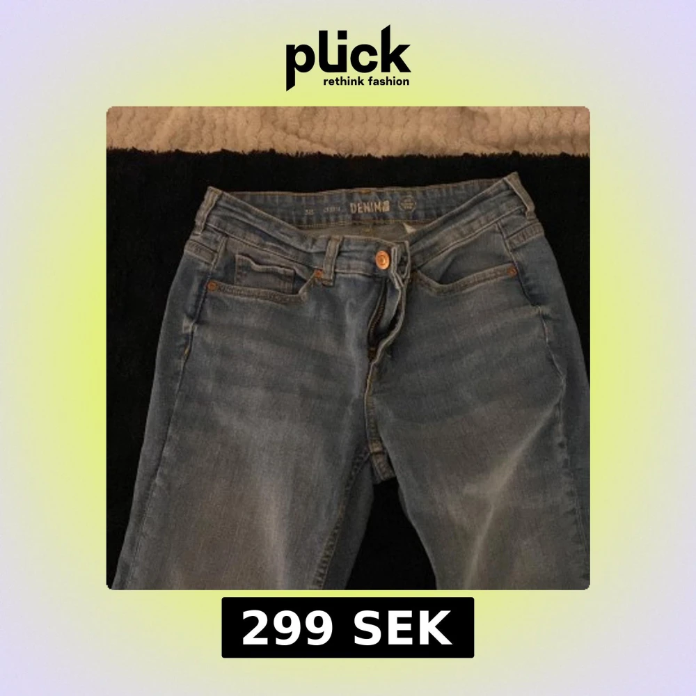 Säljer ett par klassiska blå jeansbyxor från Denim. De har en normal passform med dragkedja och knapp framtill. Byxorna har fem fickor och en snygg tvättad look. Perfekta för en avslappnad stil.
