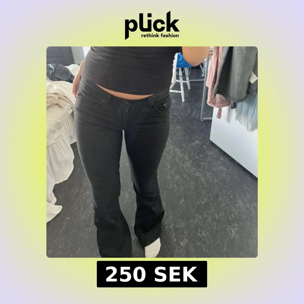 Säljer ett par svarta jeans med bootcut-modell och låg midja. Sitter tajt över låren och släpper ut vid vaden för en snygg siluett. Klassisk femficksdesign och tillverkade i stretchig bomullsdenim. Perfekta till sneakers eller boots.