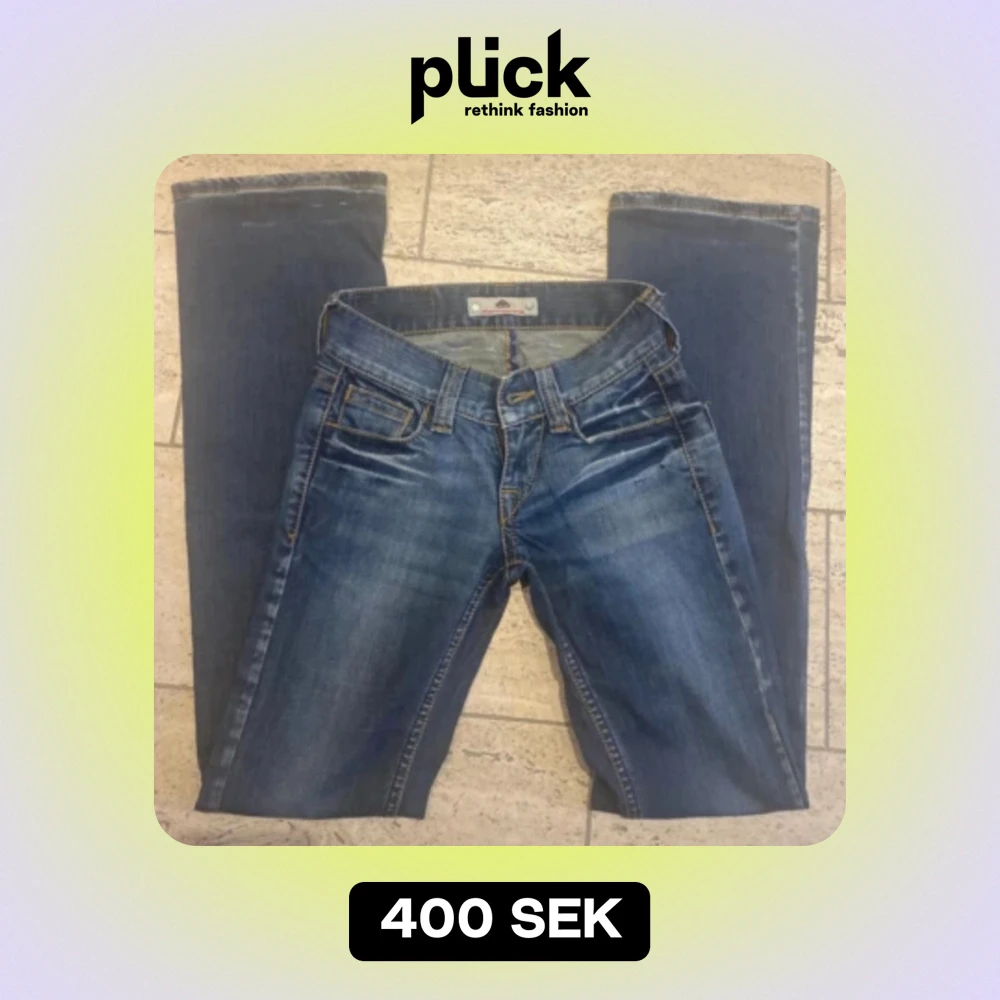 Super snygga jeans som tyvärr är för små. Hittar ingen storlek men skulle uppskatta som sx. Midjemått 36 och innerbenslängd 78