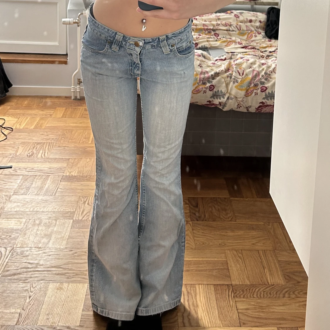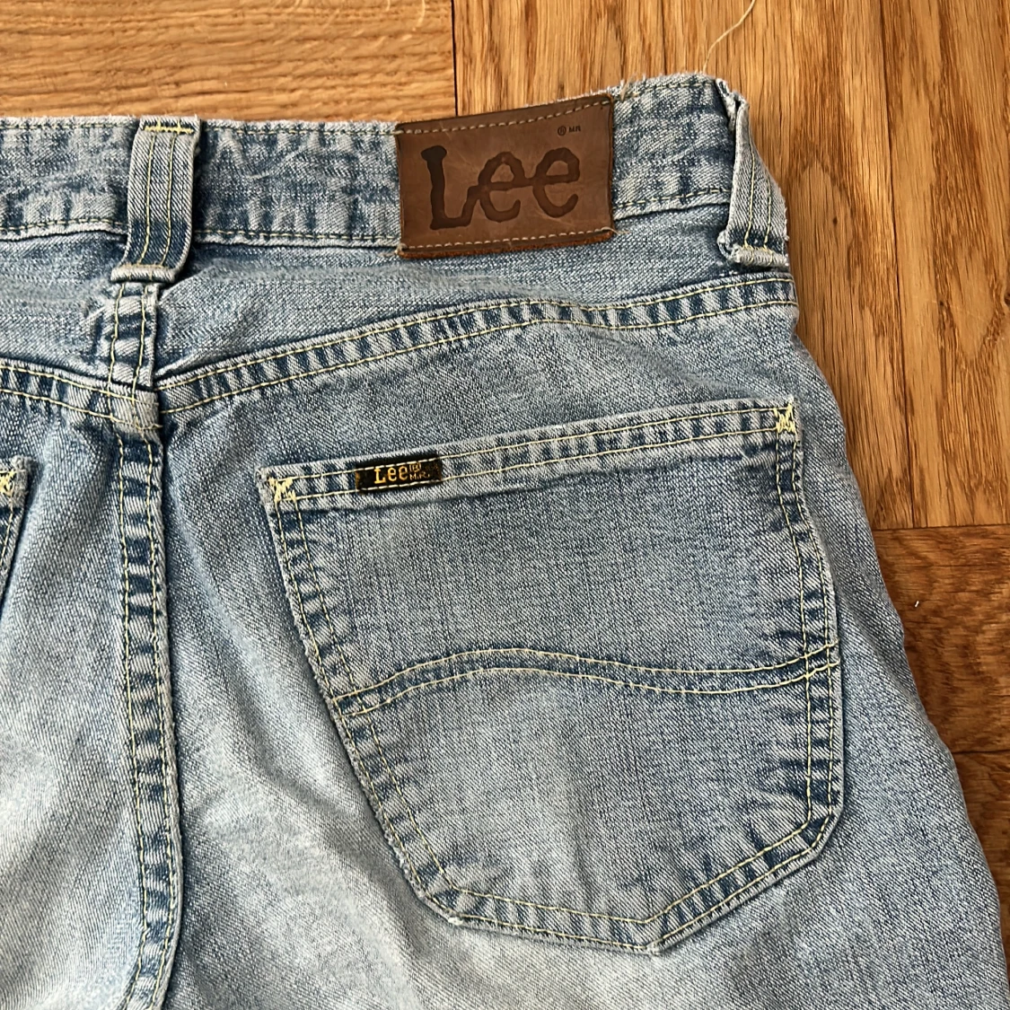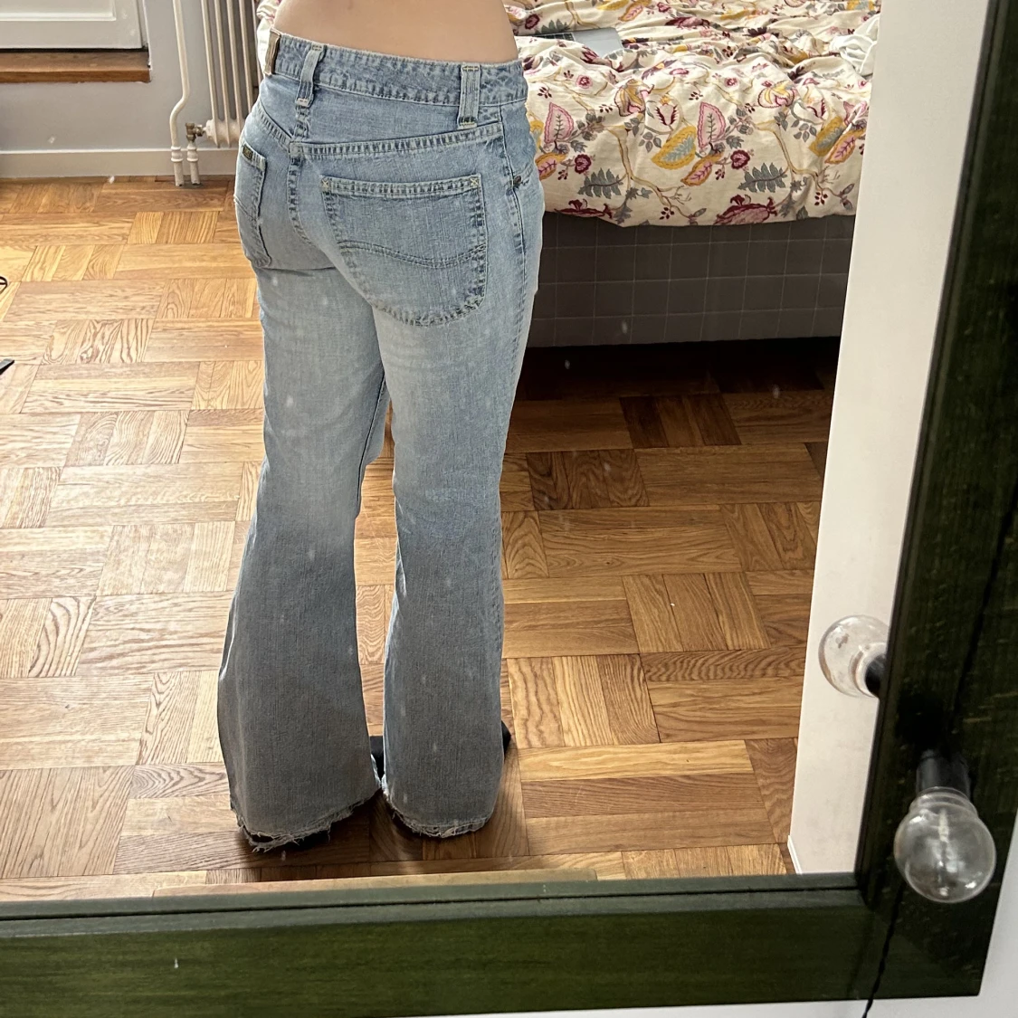 super snygga lee jeans som är pyttelite slitna längst ner ( bild 2) midjemått (mätt rakt över) 37,5cm innerbens längd 80cm. lägger upp igen, använder INTE ”köp nu”💕