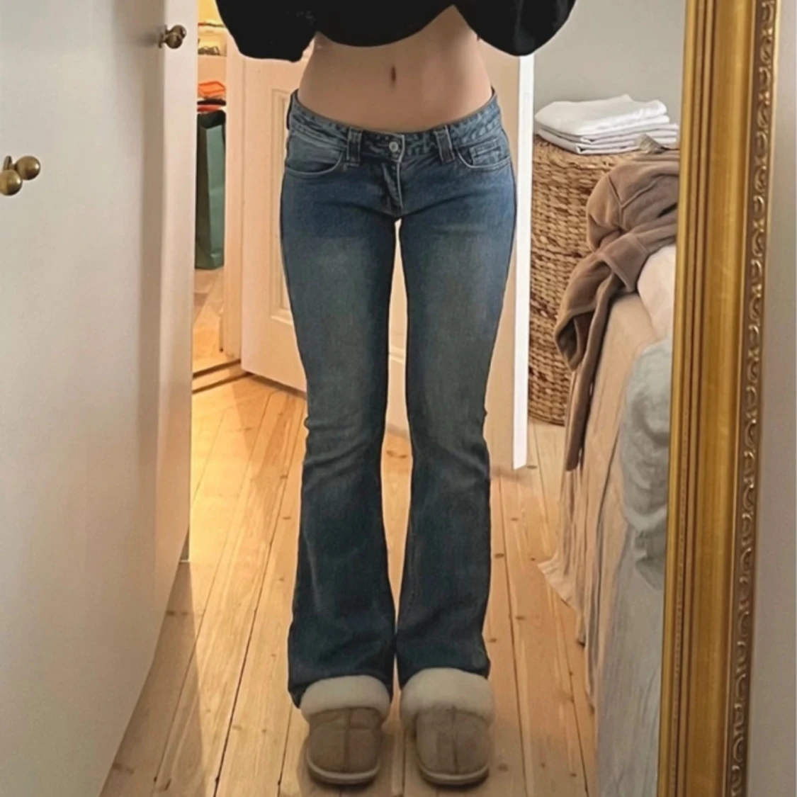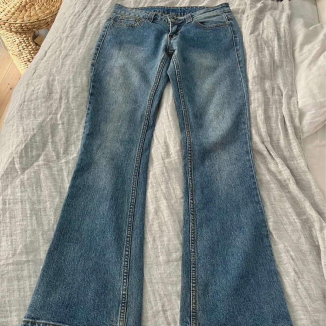 !Lånade bilder! Lågmidjade ”Kylie jeans” från Brandy Melville köpta från Vinted. Varken jag eller säljaren innan har använt de mycket, så de är u ett väldigt fint skick❣️ Midjemått: 39x2 Innerbenslängd: 78 cm