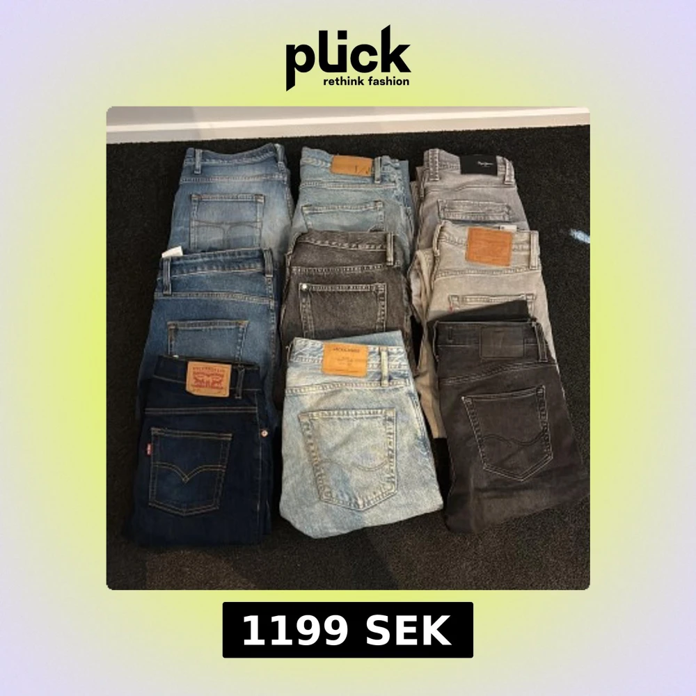 Jeans bulk för bra pris. 9 par jeans från olika märken. Dessa jeans kan minst säljas för 200-250 styckvis.