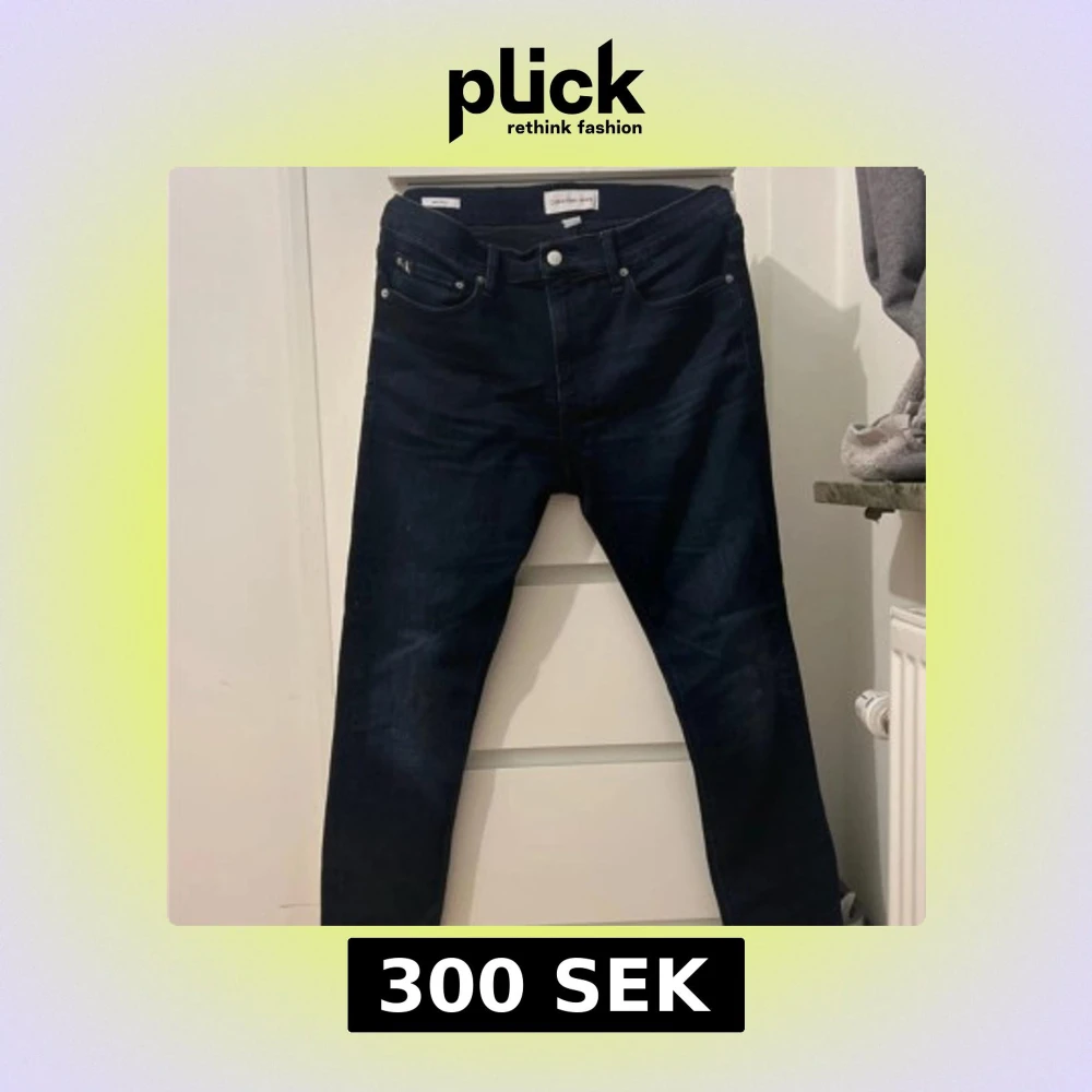 W34 L32. Snygga mörkblå jeans från Calvin Klein Jeans i klassisk femficksmodell. Jeansen har raka ben och normal passform, med diskreta sömmar och metallknapp med CK-logga. Perfekta för dig som gillar stilrena och tidlösa jeans.