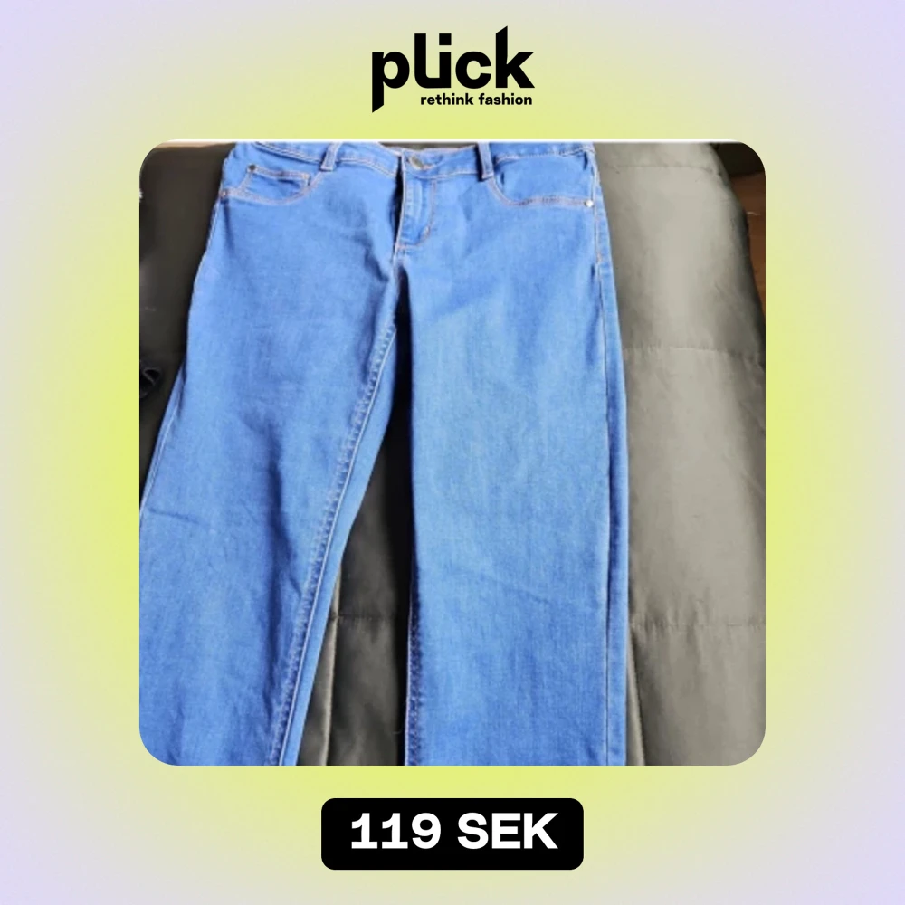 Nya Mjuka jeans i strl L men skulle nog säga att dom är mer som M skullenog säga att färgen är mellanblå. Dragkedja och knappar. Katt finns I hemmet