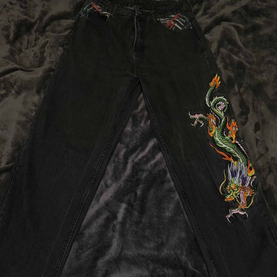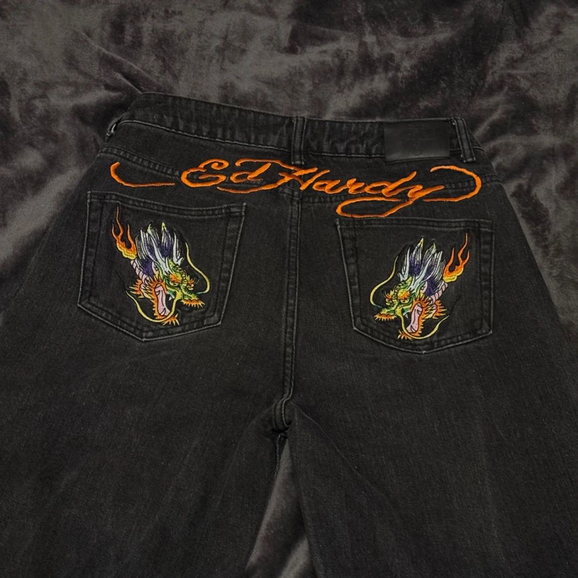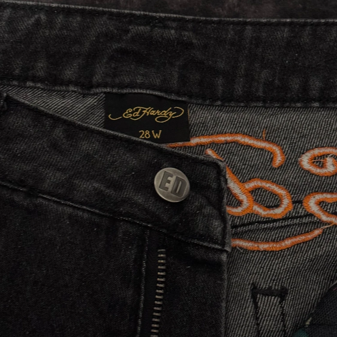 Unika svarta jeans från Ed Hardy med färgstarkt broderad drake längs ena benet. Klassisk femficksmodell med coola mönstrade detaljer i fickorna och insidan. Jeansen har dragkedja och knapp med ED-logga. Perfekt för dig som vill sticka ut med edgy streetstyle.