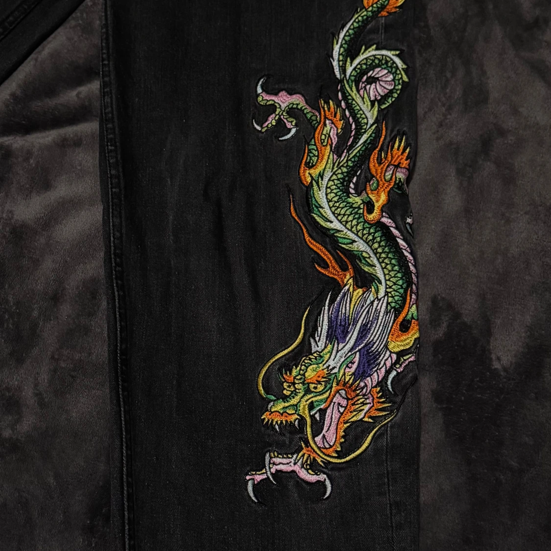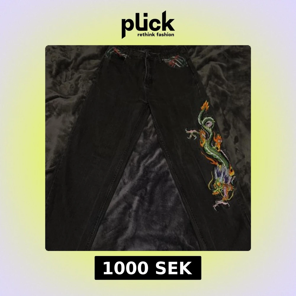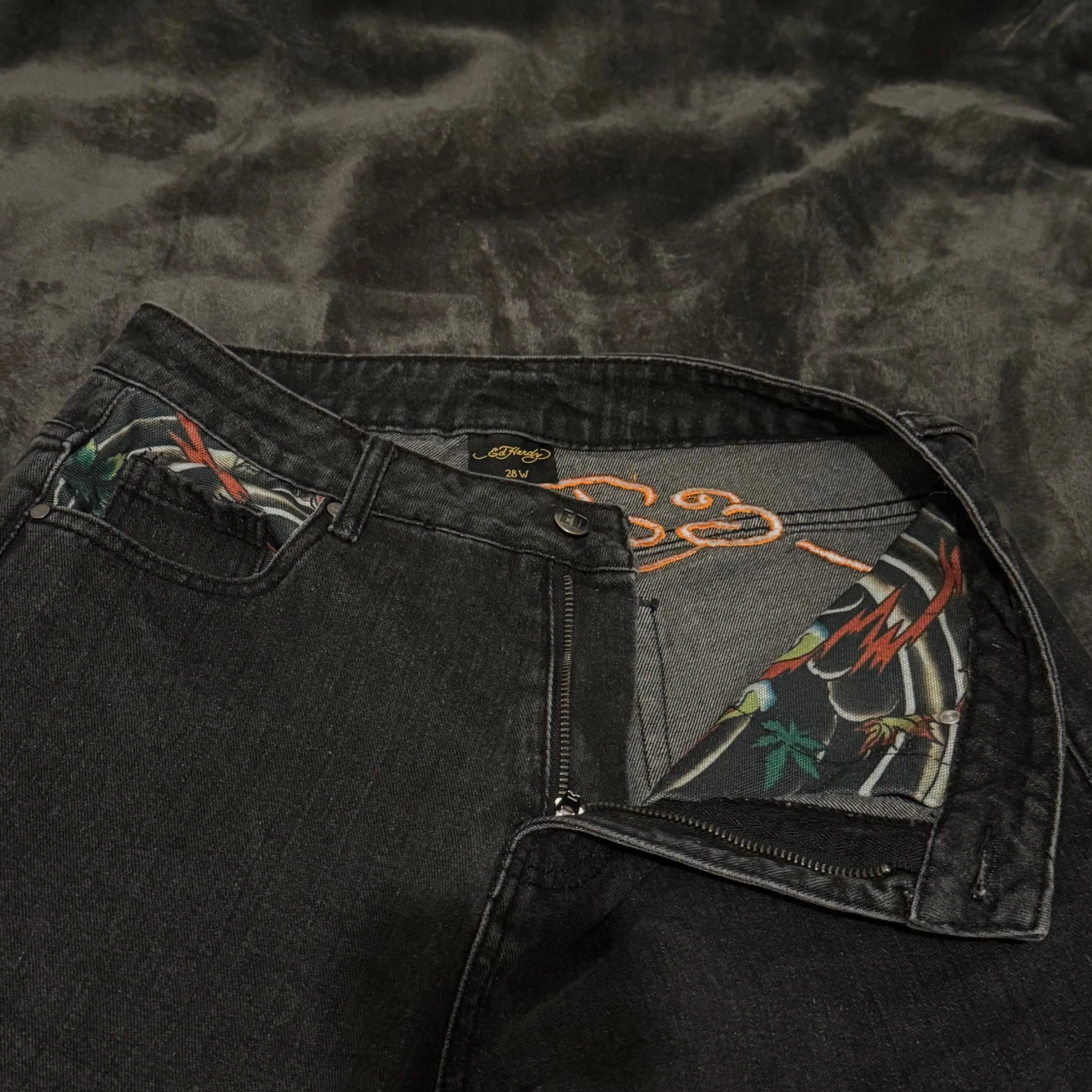 Unika svarta jeans från Ed Hardy med färgstarkt broderad drake längs ena benet. Klassisk femficksmodell med coola mönstrade detaljer i fickorna och insidan. Jeansen har dragkedja och knapp med ED-logga. Perfekt för dig som vill sticka ut med edgy streetstyle.