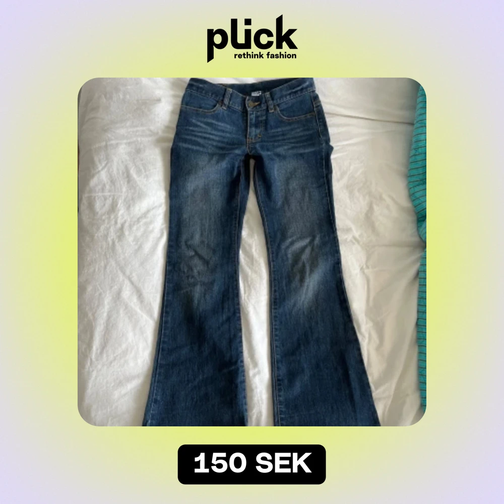 Snygga bootcut jeans. De är i helt nyskick utan slitningar💗 De är i storlek 152 men passar mig som är 160 bra! Midjemått 36cm, innerbenslängd 73cm
