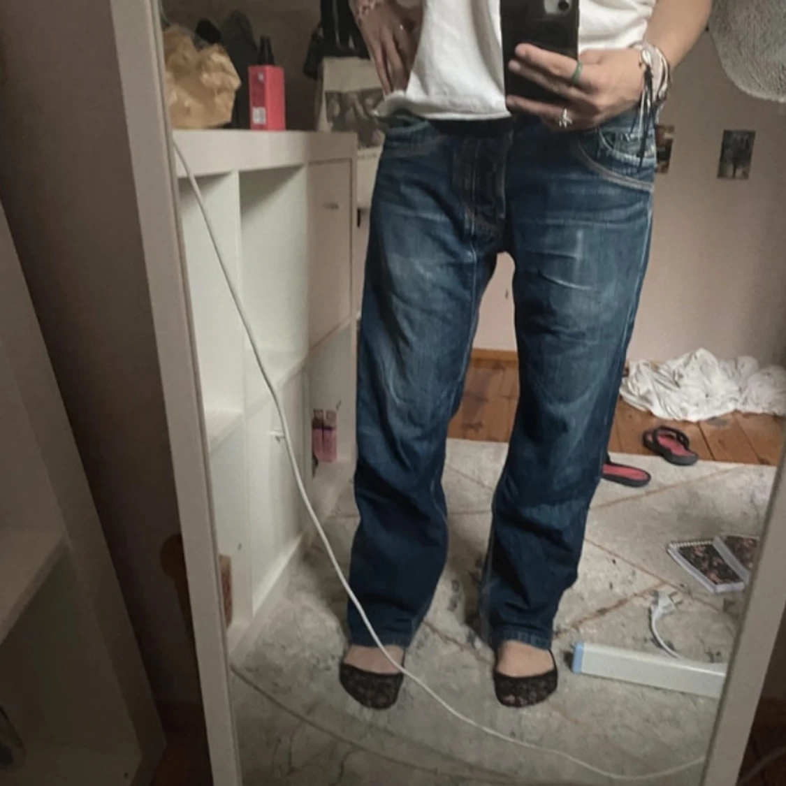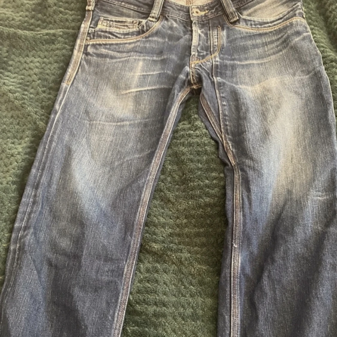 I mycket bra skick, lite sliten längst ner på högra benet (fråga gärna om bild om ni undrar) Midja: 40 cm Benlängd från midja: 95 cm