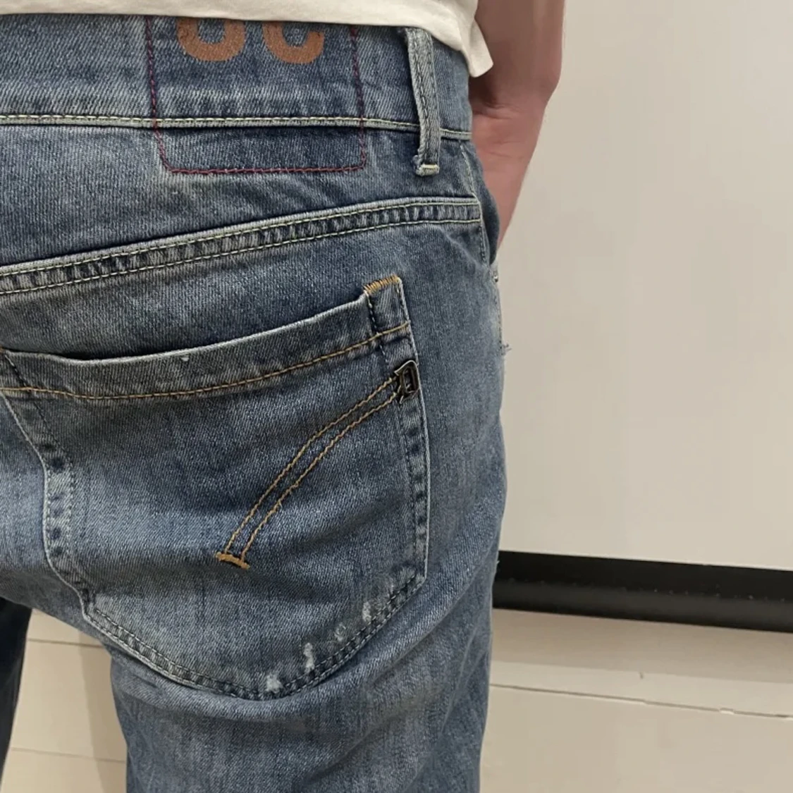 Jeans fran Dondup - Logotyp pa höger bakficka - Storlek: 38 - Passform - George - Jeansen är i bra skick utan defekter OBS slitningarna är fran början - Varat pris: 399 SEK - Nypris: 3399 SEK - Modellen pà bilden är 193 CM och väger 90 kg