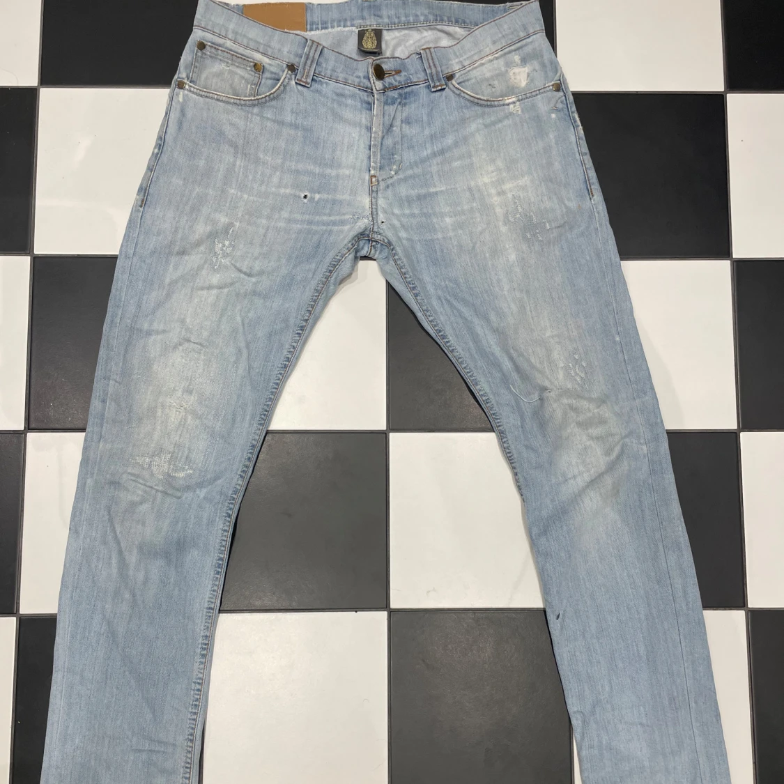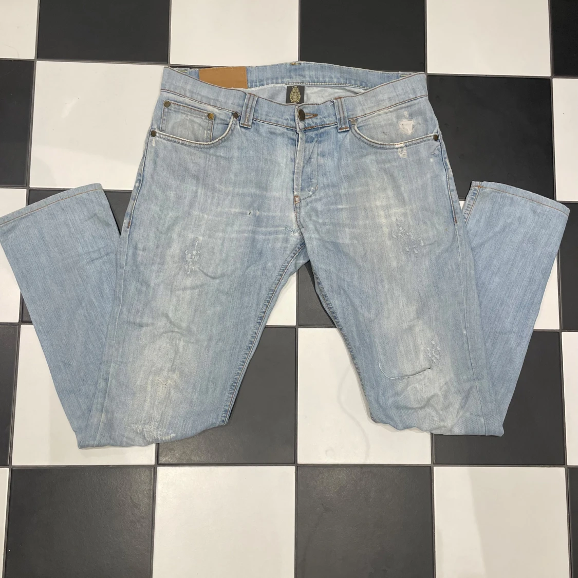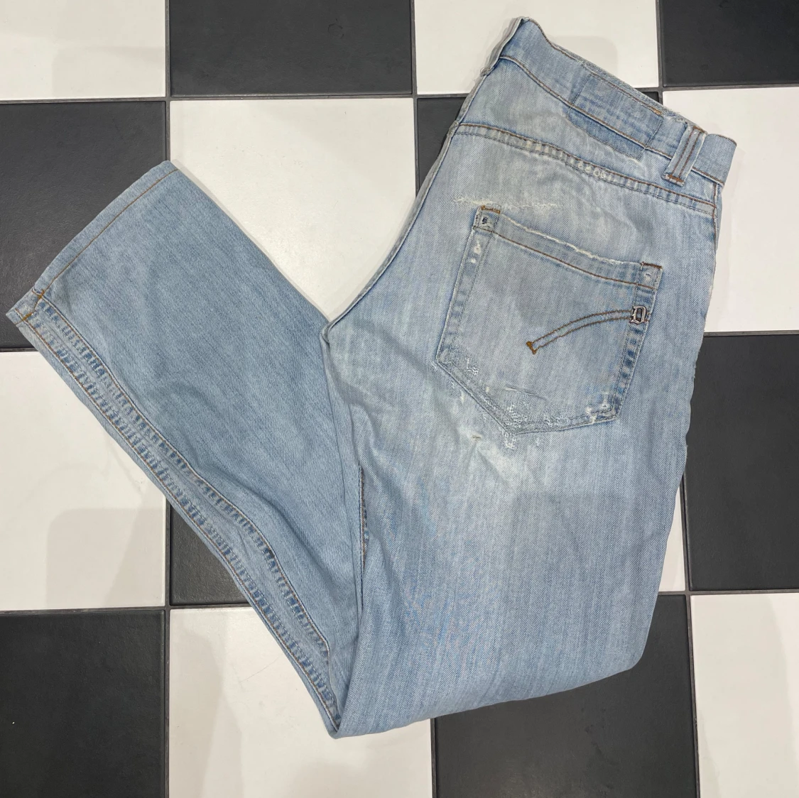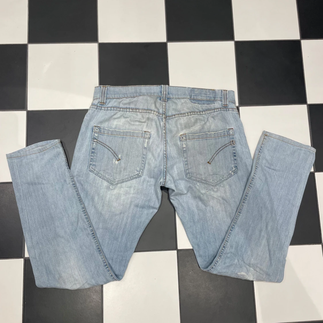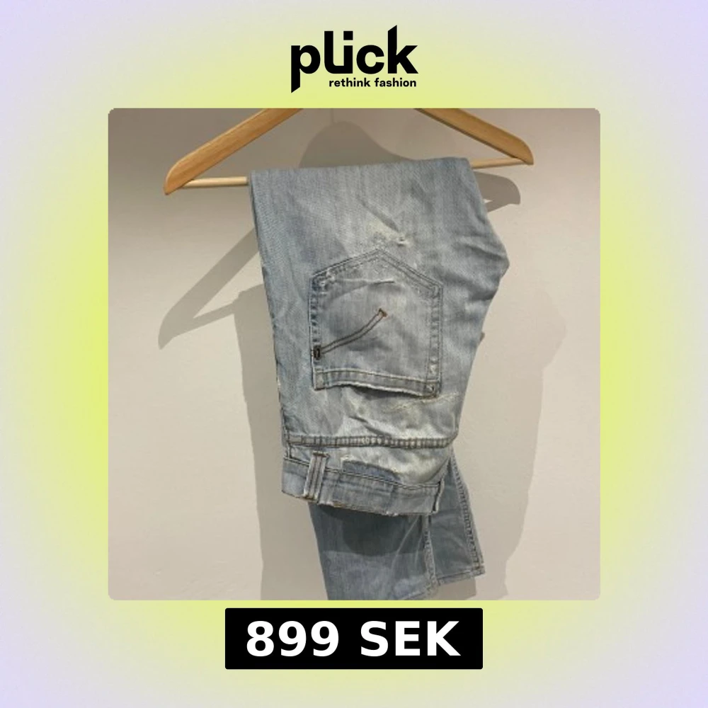 Säljer ett par riktigt snygga ljus blå dondup jeans. De är otroligt sköna och har slitningar på framsidan. De passar perfekt för nån mellan 183-188 cm. De är använda och har nån lagning men inget som märks tydligt. Ny priss ligger lite under 4000kr och många på plick säljer för över 1000kr