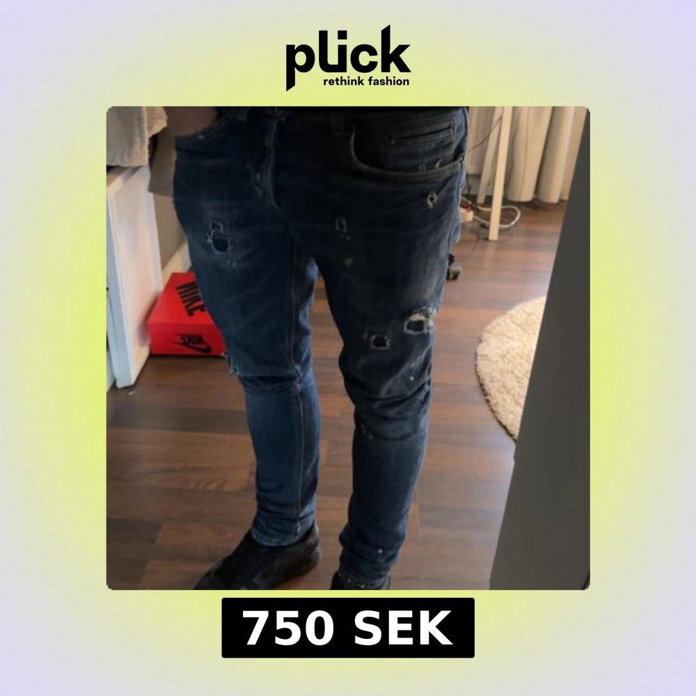 Säljer ett par blå jeans med skinny passform och flera slitningar och hål på benen för en rå och trendig look. Jeansen har klassisk femficksdesign, dragkedja och knapp framtill. Perfekta för dig som gillar streetstyle och vill sticka ut.