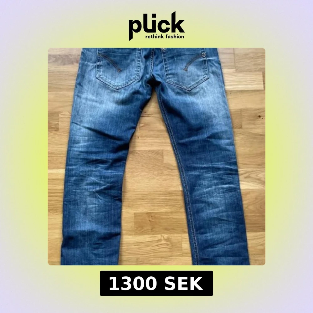 Säljer ett par blå jeans med snygga slitningar och tvättade detaljer. Jeansen har raka ben, klassiska bakfickor med dekorativa sömmar och orange kontrastsömmar. Materialet är jeans och passformen är straight