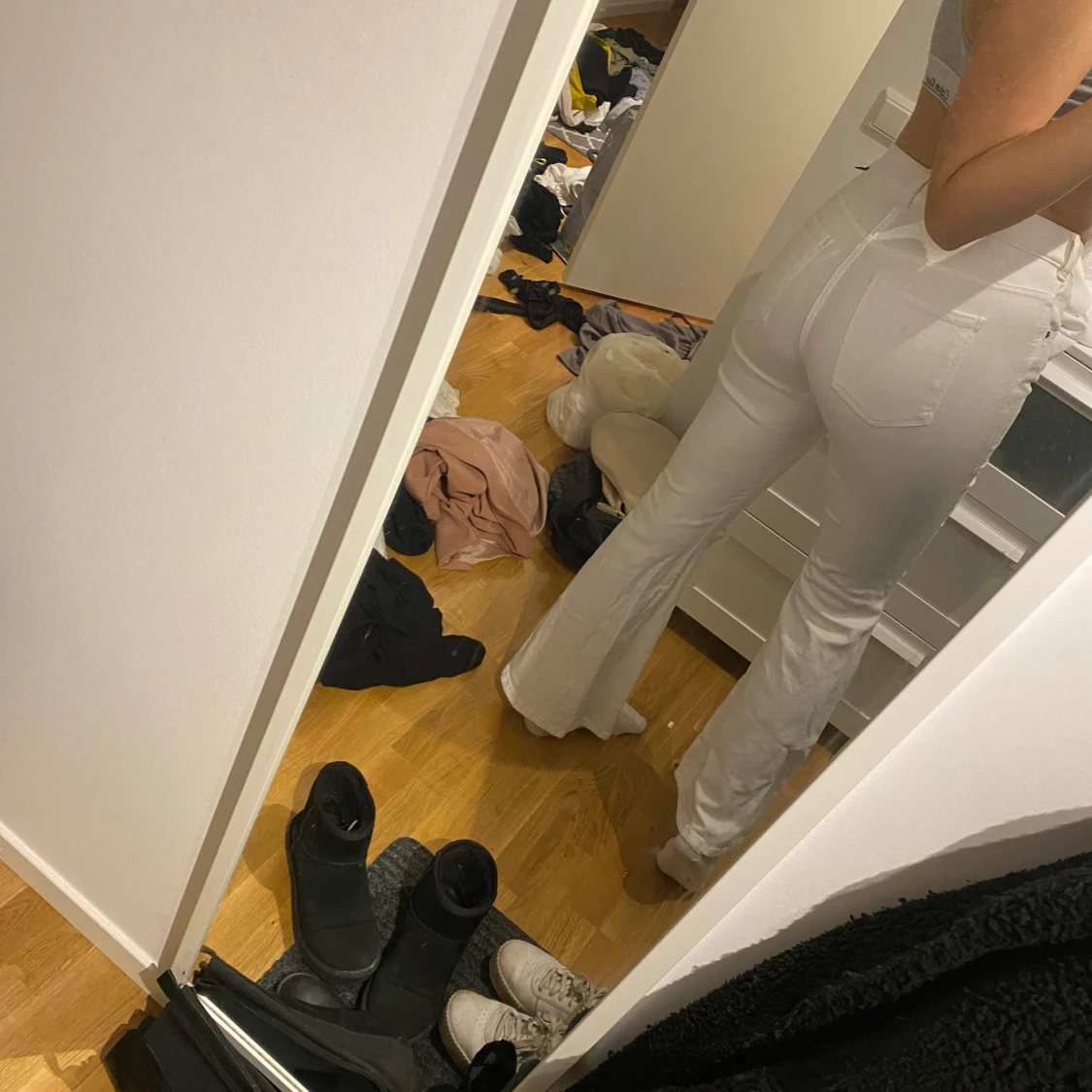 Bootcut med hål i knäna. Dom är i storlek XL men jag själv är en M i byxor och dom passar mig. Väldigt bekväma, elastiskt material.