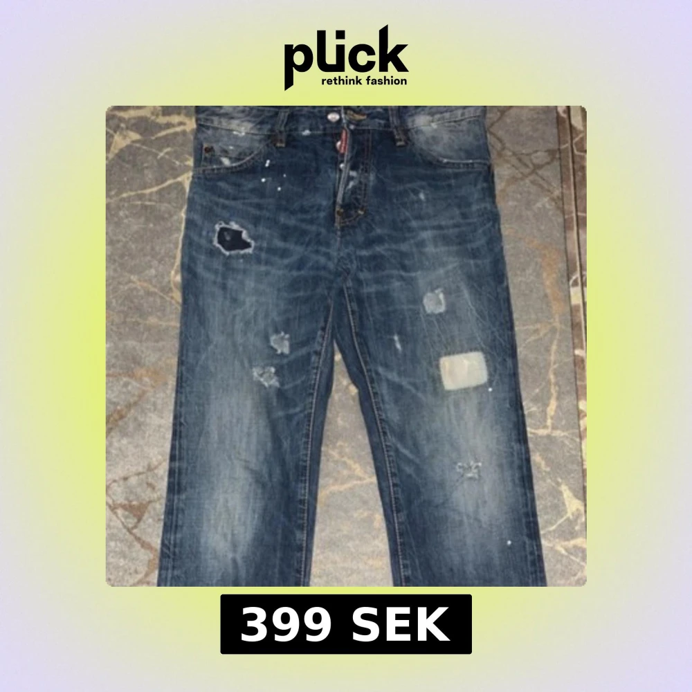 Snygga blå jeans från Dsquared2 med slitningar, lagade hål och patchar på benen. Klassisk femficksmodell med läderpatch bak i midjan. Jeansen har en rak passform och coolt distressed utseende. Tillverkade i Italien av bomull.
