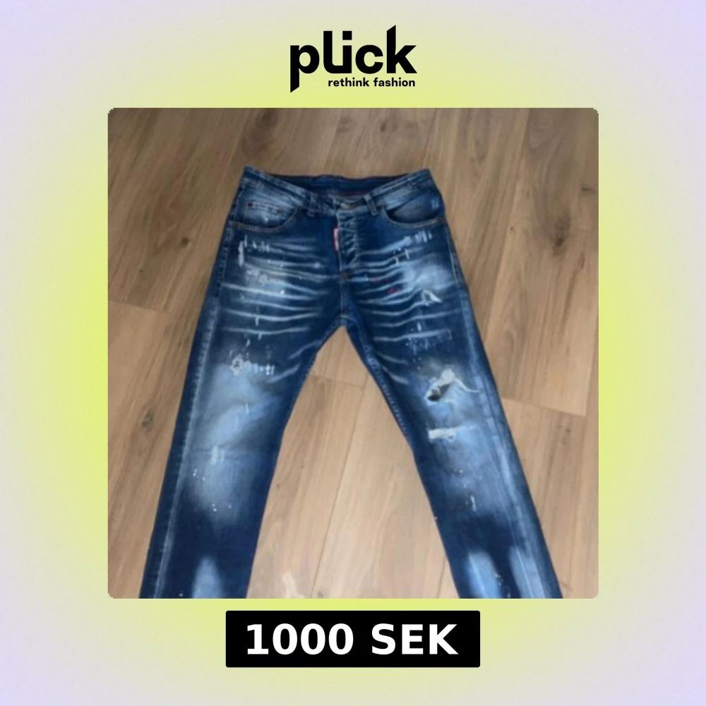 Säljer ett par blå jeans från Dsquared2 med coola slitningar, färgstänk och en stor röd-vit patch med lönnlöv och text bak på linningen. Jeansen har en smal passform och klassisk femficksdesign. Perfekta för dig som gillar streetstyle och detaljer.