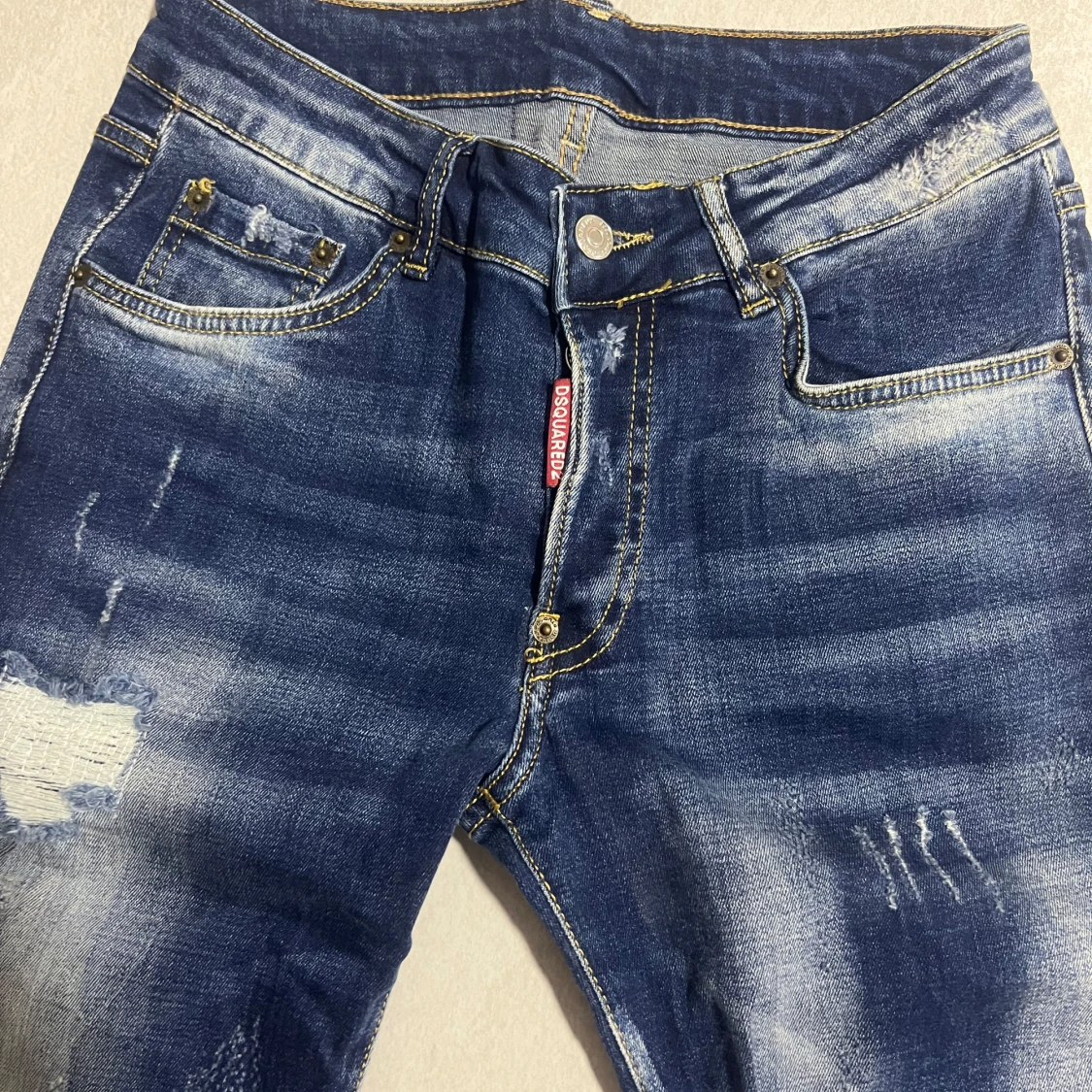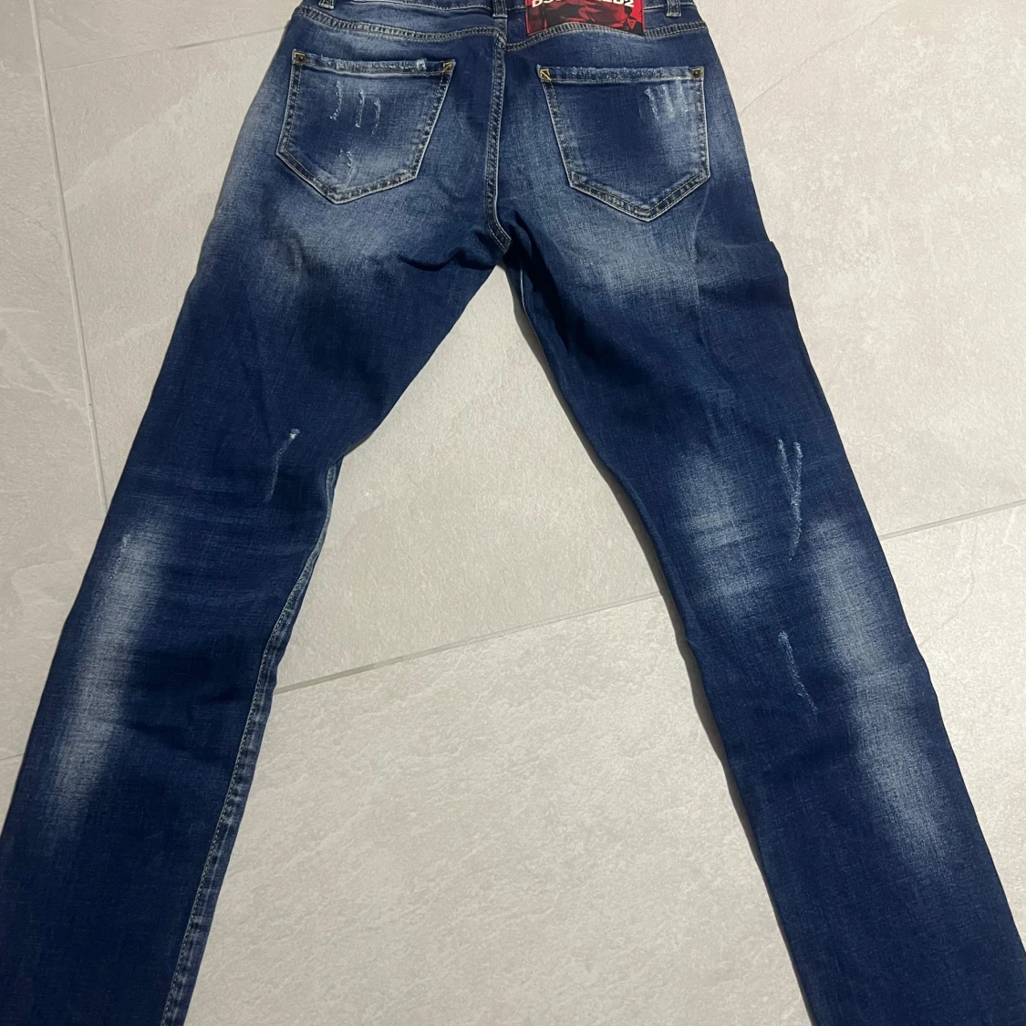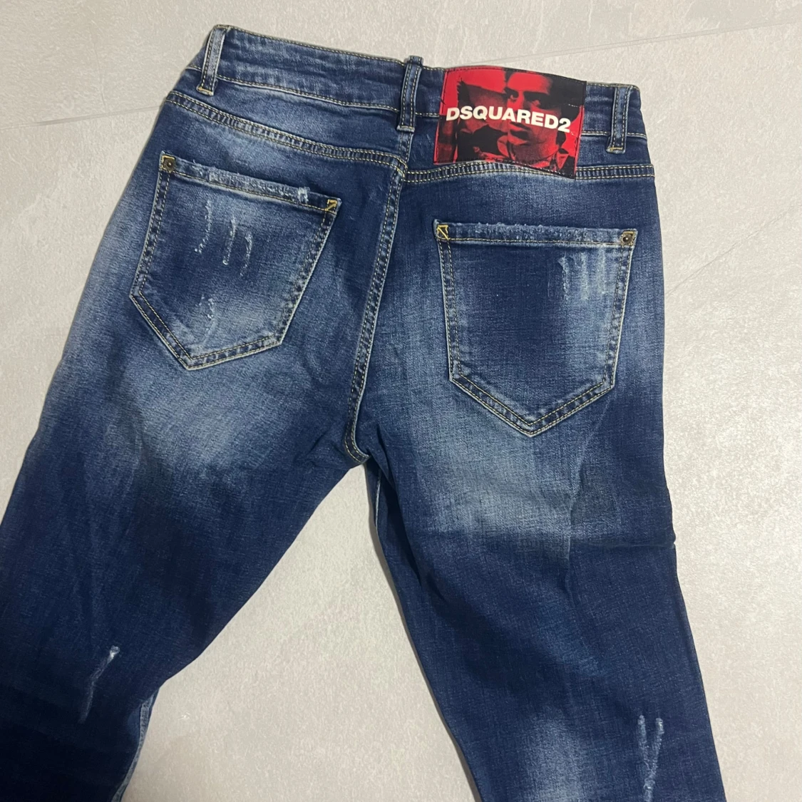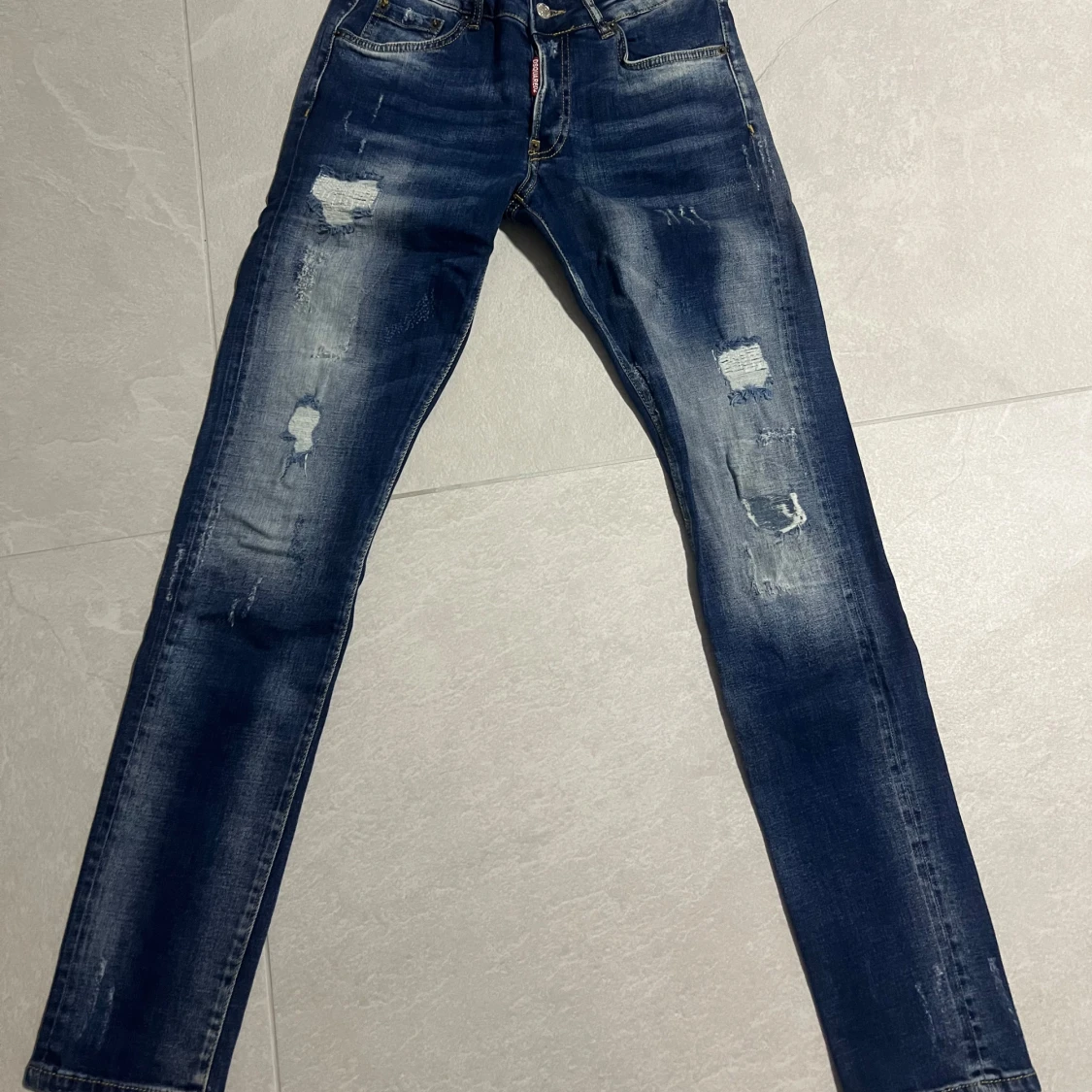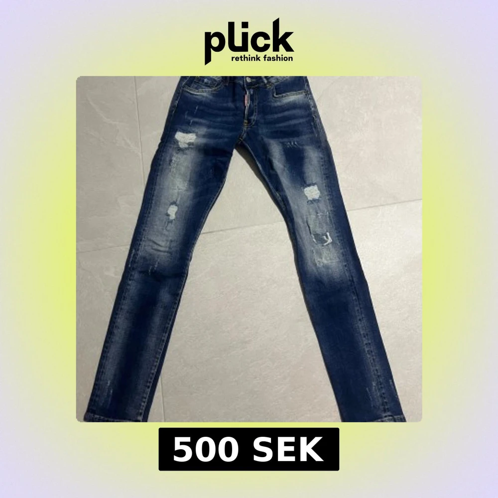 Snygga blå jeans från Dsquared2 med tydliga slitningar och distressed detaljer framtill och baktill. Är i nyskick! Strl 156-164