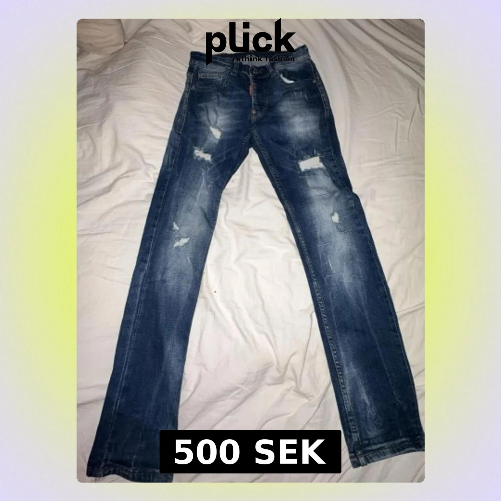 Säljer ett par blå jeans från Dsquared2 med slitna detaljer och snygg tvätt. Jeansen har raka ben, klassisk femficksmodell och coola slitningar framtill. Tillverkade i 100% bomull för skön känsla och passform.