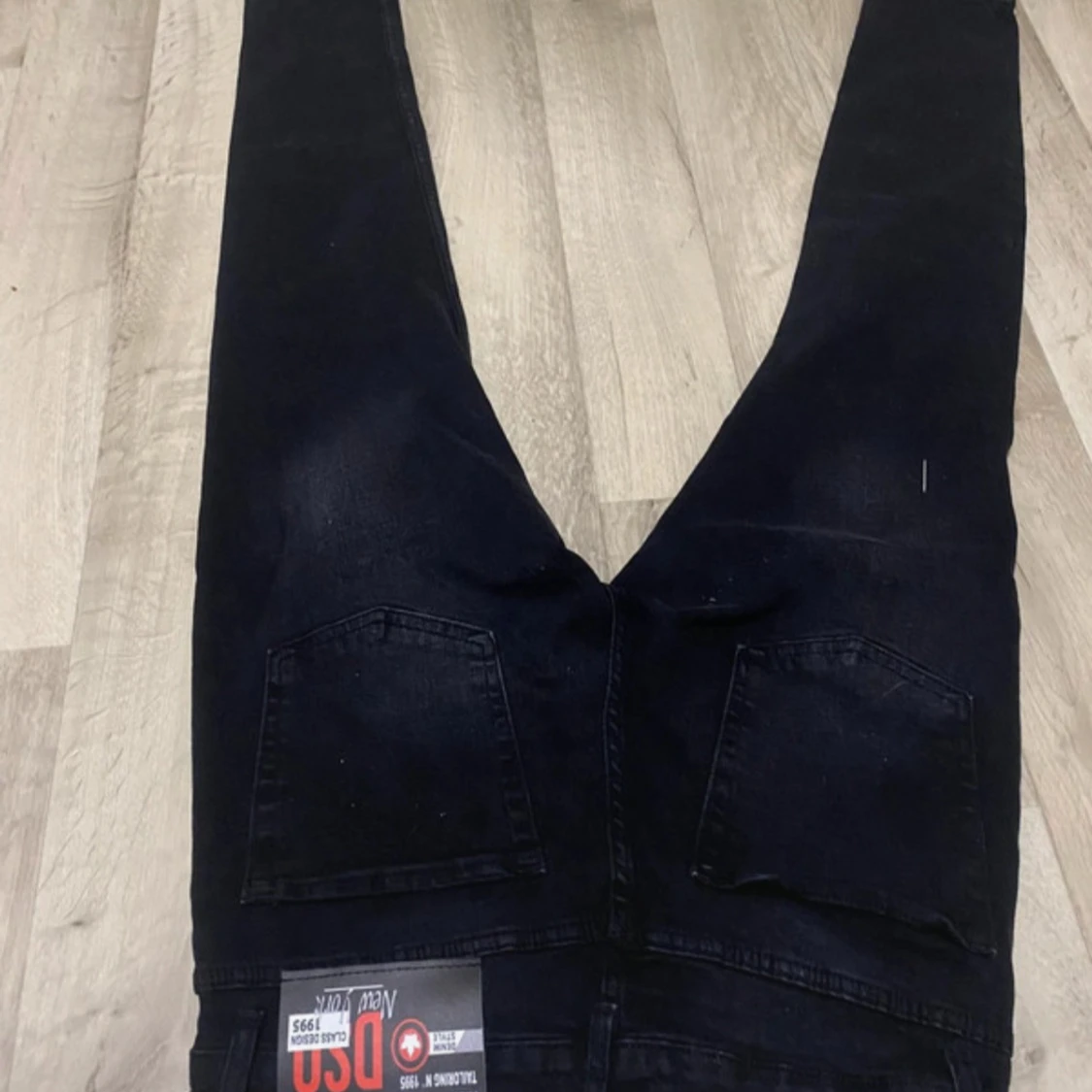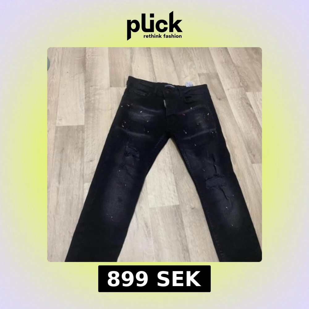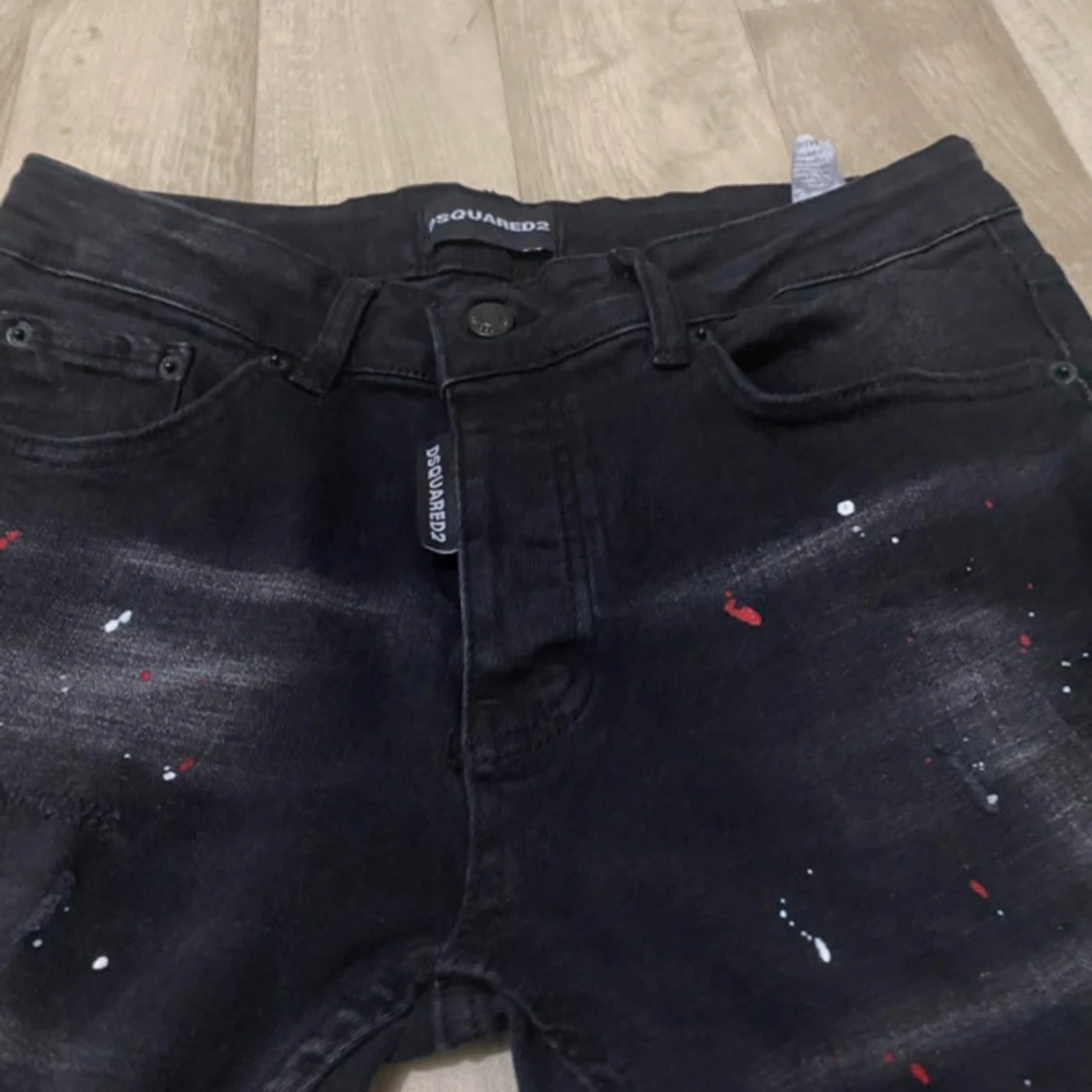 Säljer ett par svarta jeans från Dsquared2 med coola färgstänk i rött och vitt samt slitna detaljer på benen. Jeansen har klassisk femficksdesign, raka ben och är tillverkade i stretchig denim för skön passform.