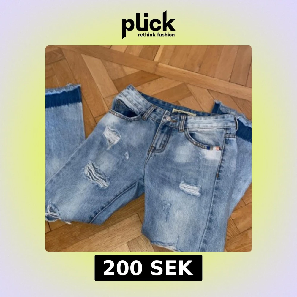 Säljer ett par ljusblå jeans med slitningar och hål på framsidan. Byxbenen har en mörkare blå kant nertill och råa, fransiga avslut. Klassisk femficksmodell med normal passform och hög midja.