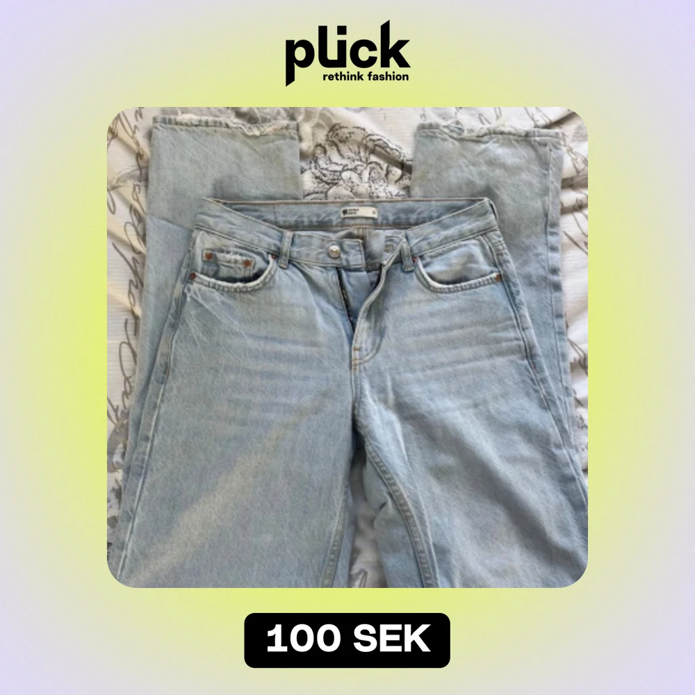 Säljer mina fina blåa jeans från gina. Ljusblå och fin färg, storlek 32. Dem är straight/lite baggy. Lite slitningar vid bakfickorna och längst ner vid benen men som bara är snyggt. Det finns lite fläckar längst ned vid benen men som inte märks av❣️
