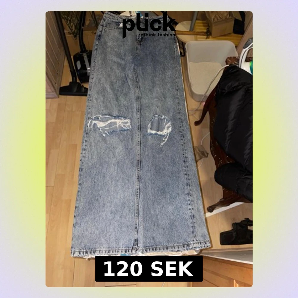 Säljer ett par jeans från NA-KD i klassisk blå denim. Byxorna har slitna detaljer och hål på framsidan,har fickor både fram och bak. Perfekt för dig som gilla en avslappnad stil.