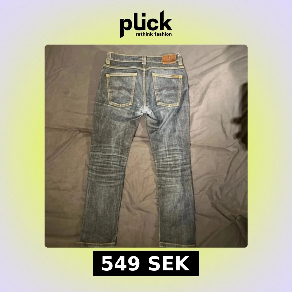 Snygga jeans från Nudie Jeans Co i en klassisk blå färg. De har en normal passform med en midwaist design. Jeansen har en dragkedja och knappar framtill samt kontrasterande sömmar som ger en cool look. De är av modellen grim tim i färgen dry navy. Har sytts mellan benen men det syns inte. Skriv i dm om du behöver bild på det eller annat.