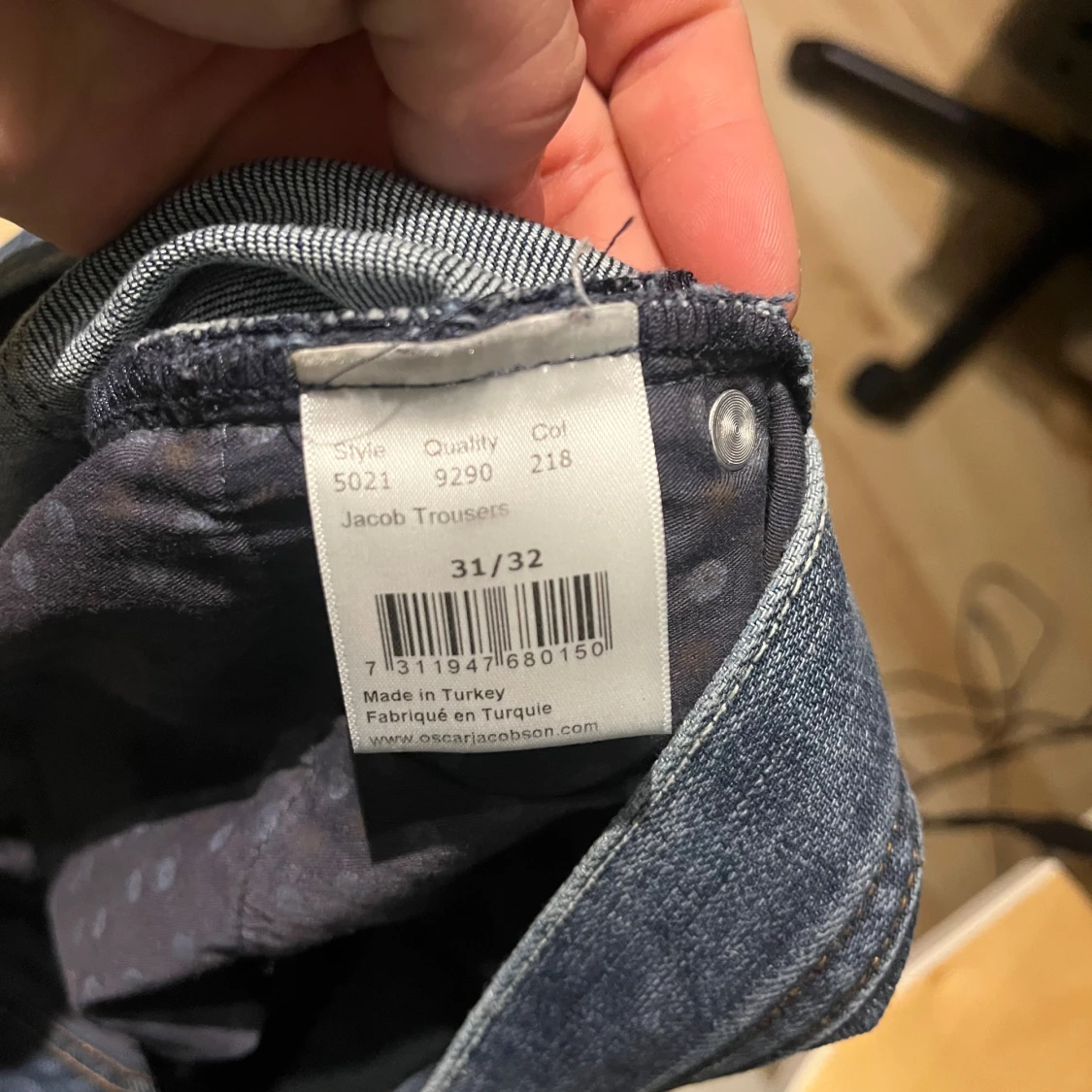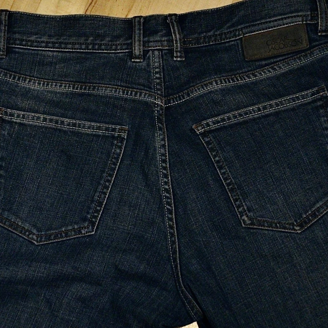 Snygga mörkblå jeans från Oscar Jacobson med klassisk femficksdesign och raka ben. Jeansen har normal passform och är tillverkade i slitstarkt bomullsjeansmaterial. Perfekt för dig som gillar stilrena och tidlösa jeans med diskret branding på bakfickan. Skicket är 9/10 hittar inga defekter alls!😁skriv för fler bilder!