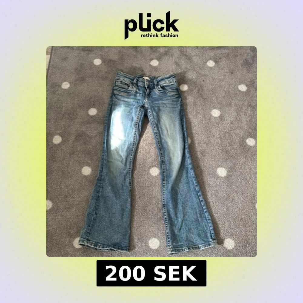 Säljer ett par blå bootcut jeans med låg midja och snyggt slitna detaljer. Jeansen har klassisk femficksdesign och är tillverkade i denim. Perfekta för dig som gillar en avslappnad och trendig look.