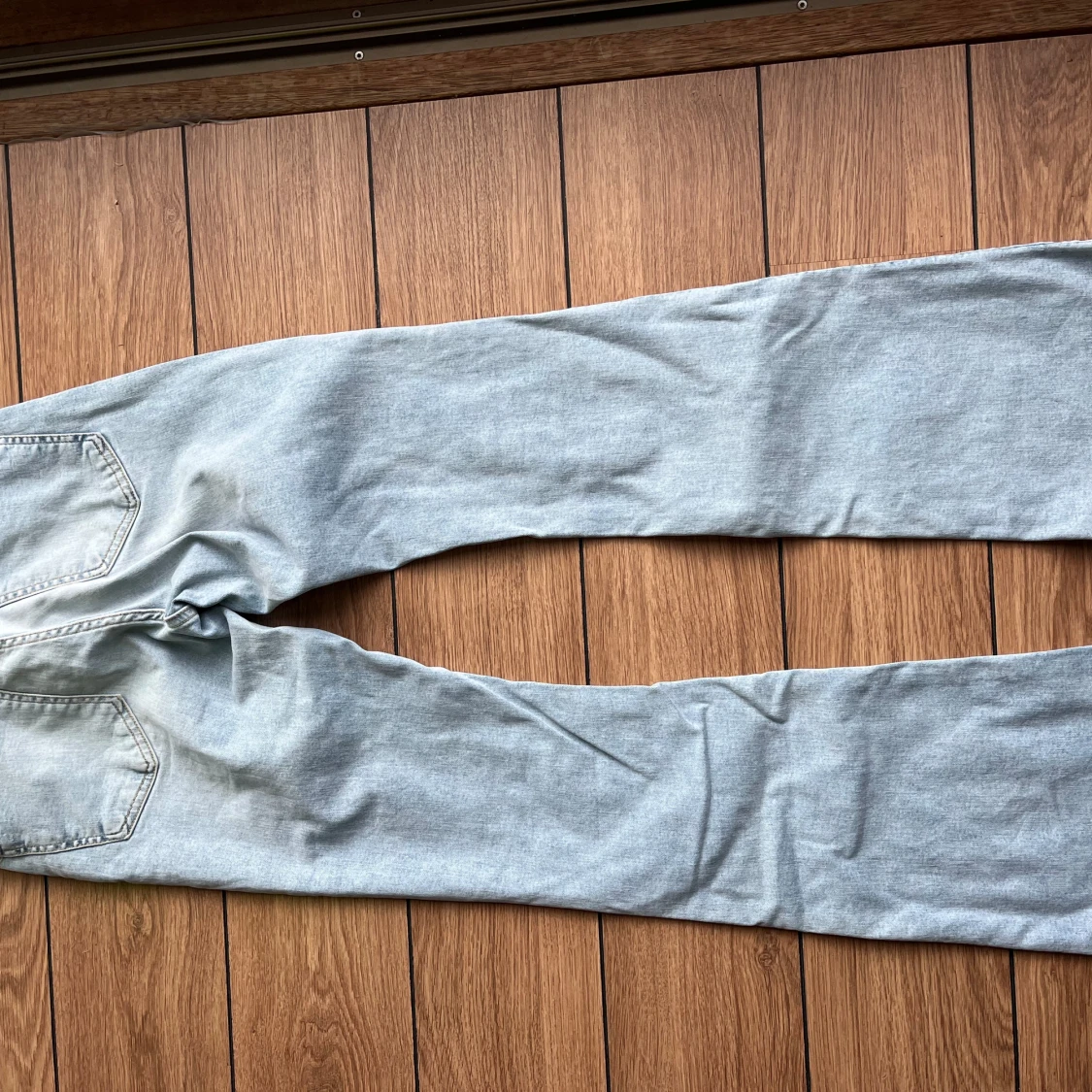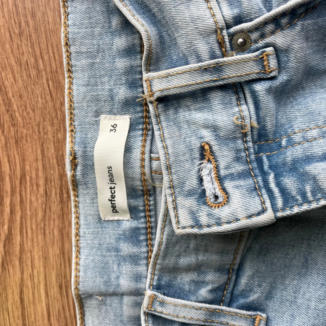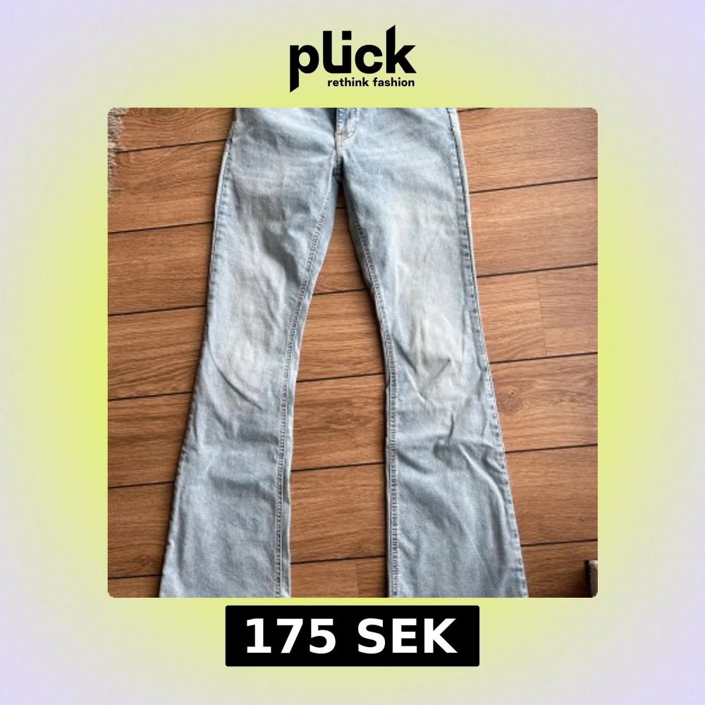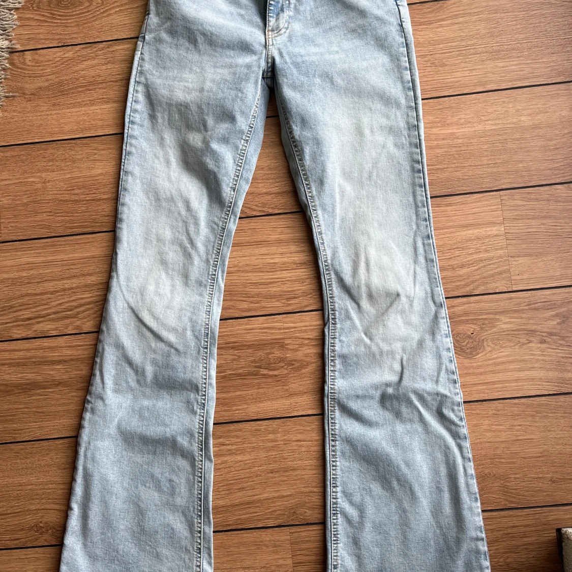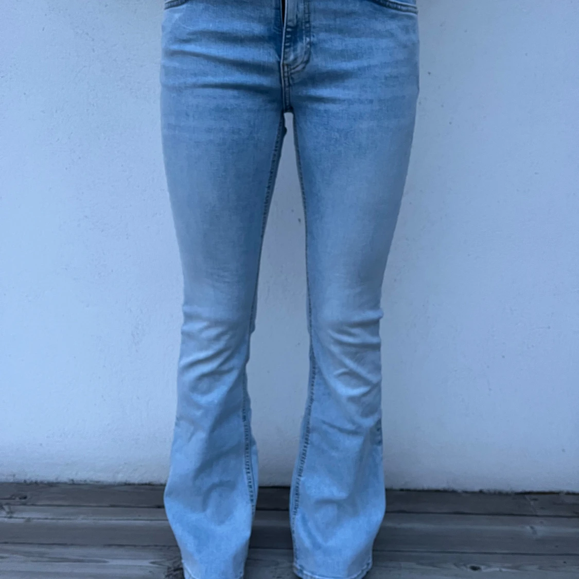 Säljer ett par ljusblå bootcut jeans från Gina Tricot, modell Perfect Jeans. De har klassisk femficksdesign, normal passform över låren och utsvängda ben. Jeansen är i mjuk denim med snygg tvätt och detaljerade sömmar.