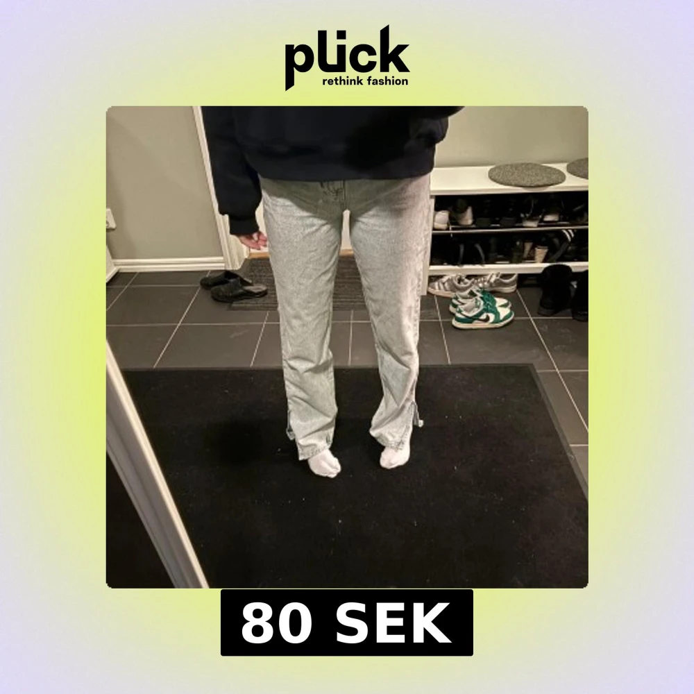 Ljusblå jeans men slits nertill använda 1 gång då dom är lite för små för mig jättebra skick