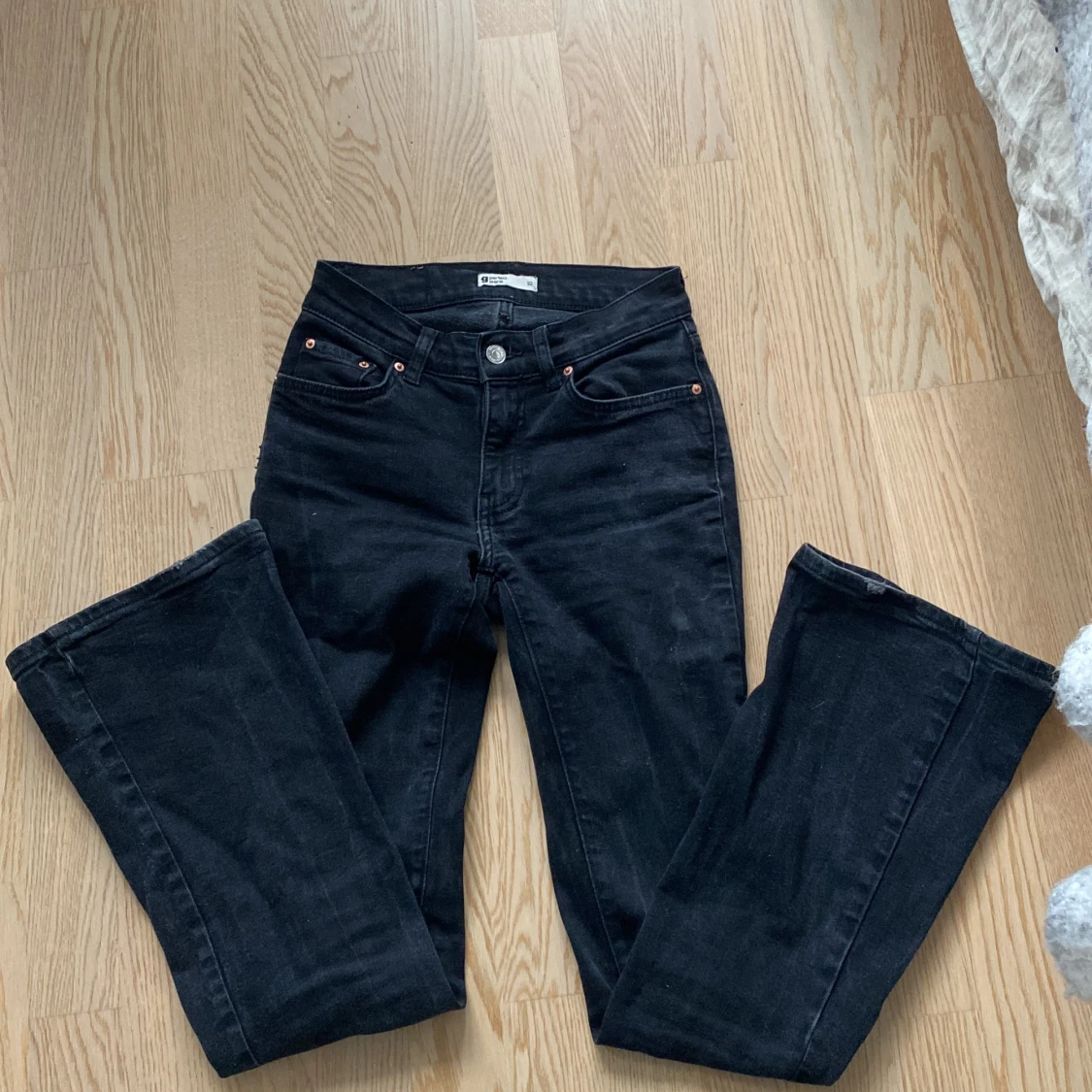 Ett par svarta lågmidjade bootcut jeans från Gina tricot. De är väl använda och är lite ljusare än på första bilden! Originalpris: 500 kr