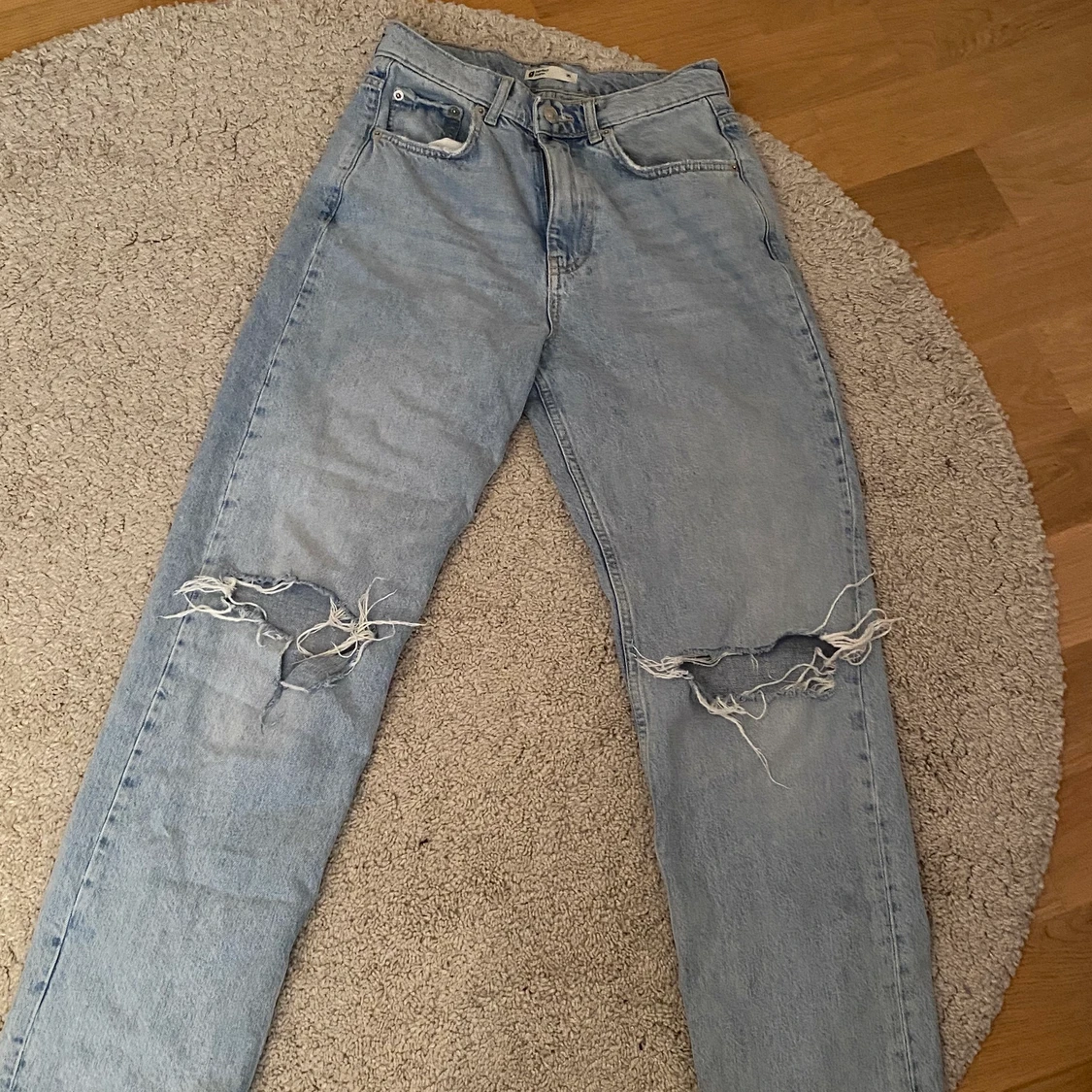 Dom är i väldigt bra skick har använt dom typ 3 gånger, dock är det en fläck på baksidan nere vid benet men det syns inte.