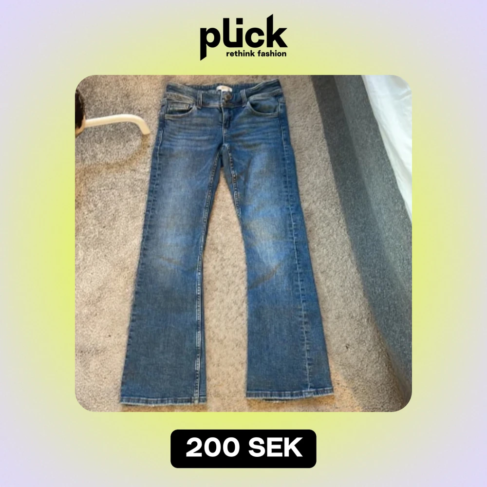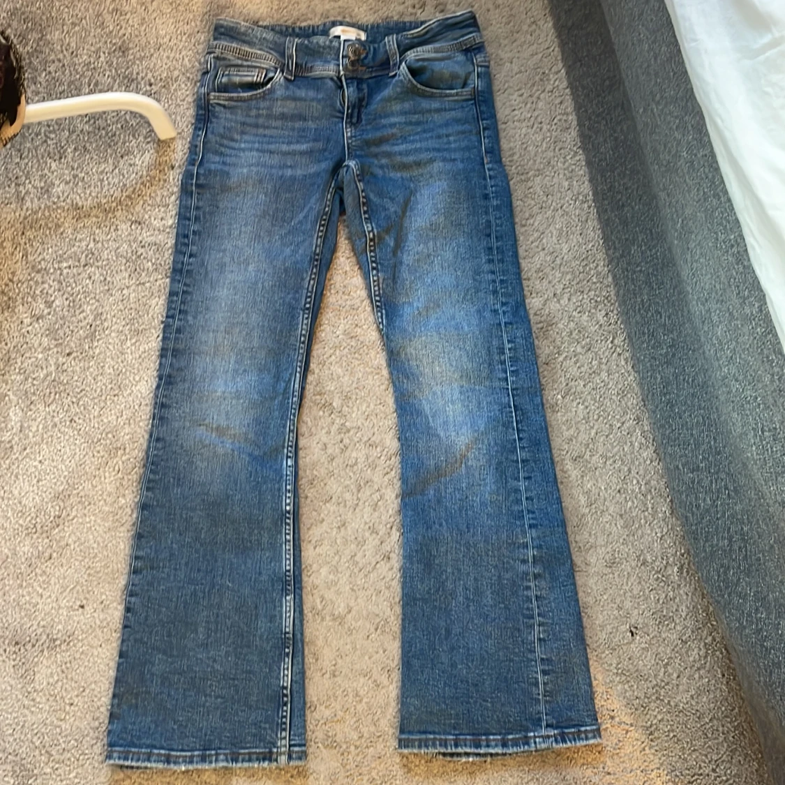 Säljer mina mörkblå chunky low waist bootcut jeans då de har blivit för små för mig, de är i fint skick och använda fåtal gånger inga defekter heller🤍De är Strl 152, nypris är 370kr mitt pris: 200kr