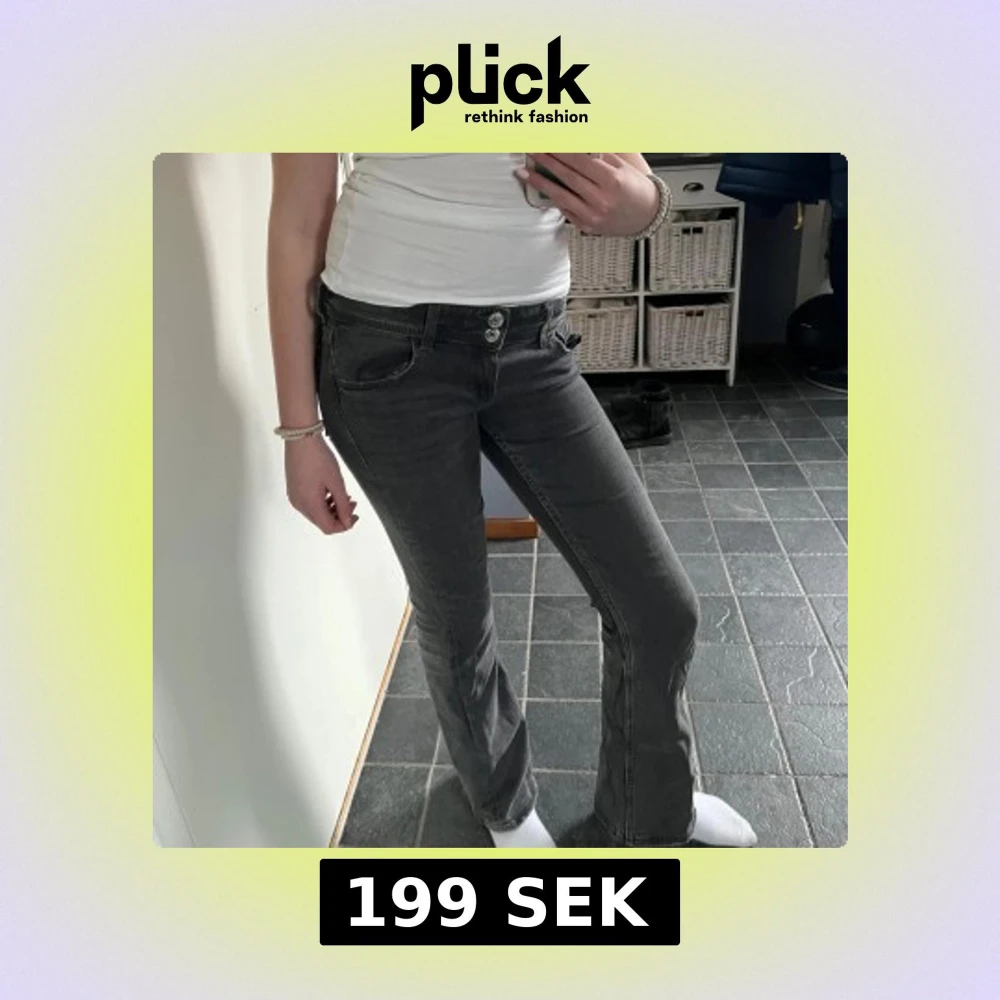 Snygga grå/svarta bootcut jeans med låg midja från ginatricot. Köptes för 350 säljer för 199. De är i storlek 152 tall så på längden ungefär 158. Om ni undrar något är det bara att skriva!