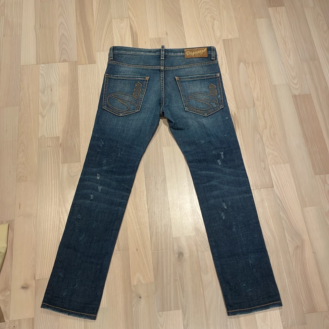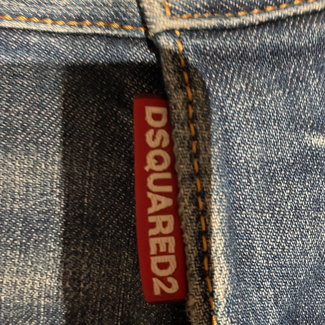 Säljer nu mina mörk blå dsquared byxor i storlek 14 år i modellen slim fit. Ben lägnden är 90 cm och i midjan år det 39 cm