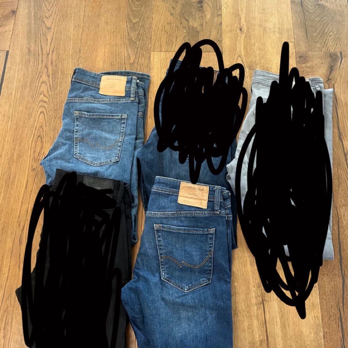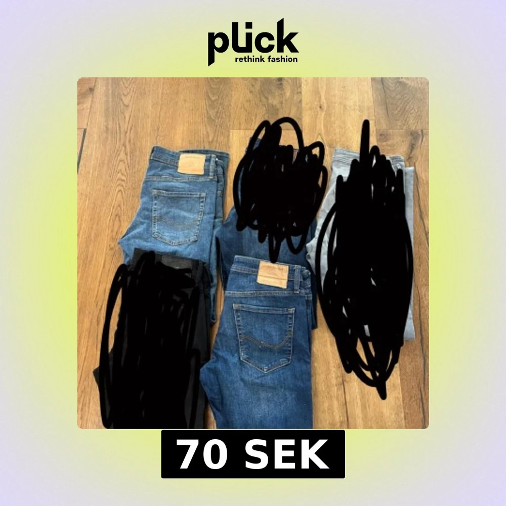 Säljer ett par klassiska blå jeans från Jack&jones med snygga kontrastsömmar och läderpatch bak i midjan. Jeansen har slim passform och normal midja, perfekta för en avslappnad och stilren look. Storlek 30/32 säljs för 70 kr styck