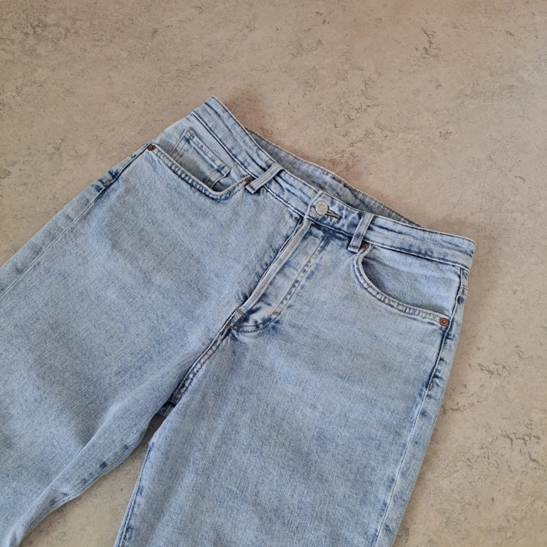 Säljer ett par ljusblå jeans med raka ben och snygga råa, fransiga kanter nertill. Klassisk femficksmodell med hög midja och bälteshällor. Perfekta för en avslappnad och trendig look.