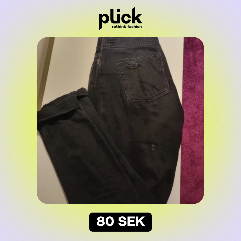 Svarta jeans med hål på knäna. Uppvikta nere men går att vika ner om man vill. Midjan är 33cm och innerbenslängden är 74cm.