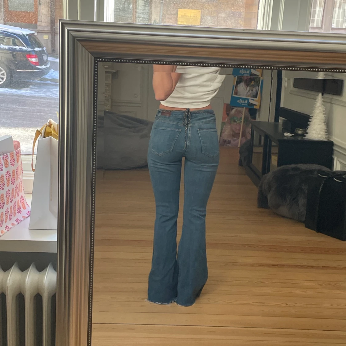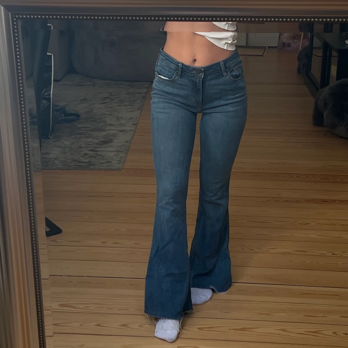 Blåa utsvängda jeans från Hollister, lite stora i midjan så har satt en band bak som ingår. Jag är 1,64 cm. Skriv för exakta mått!