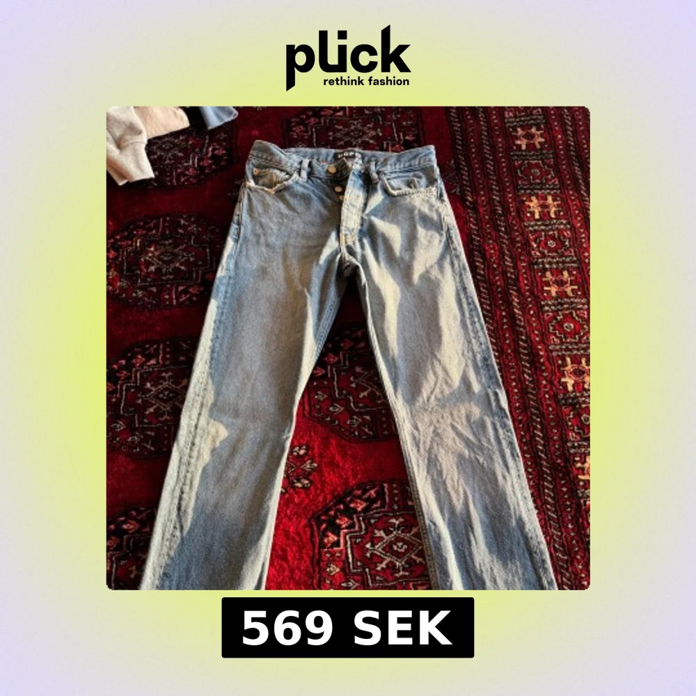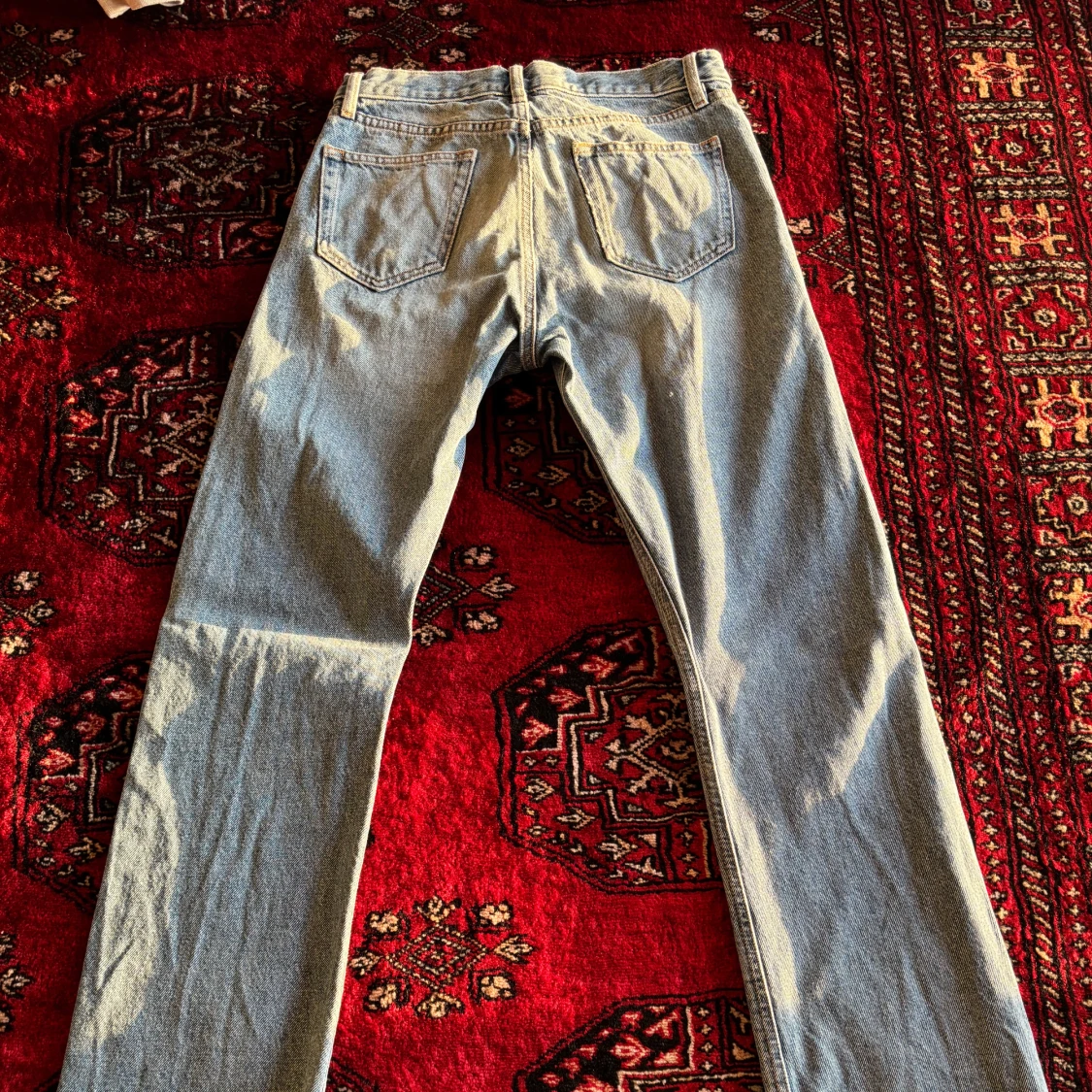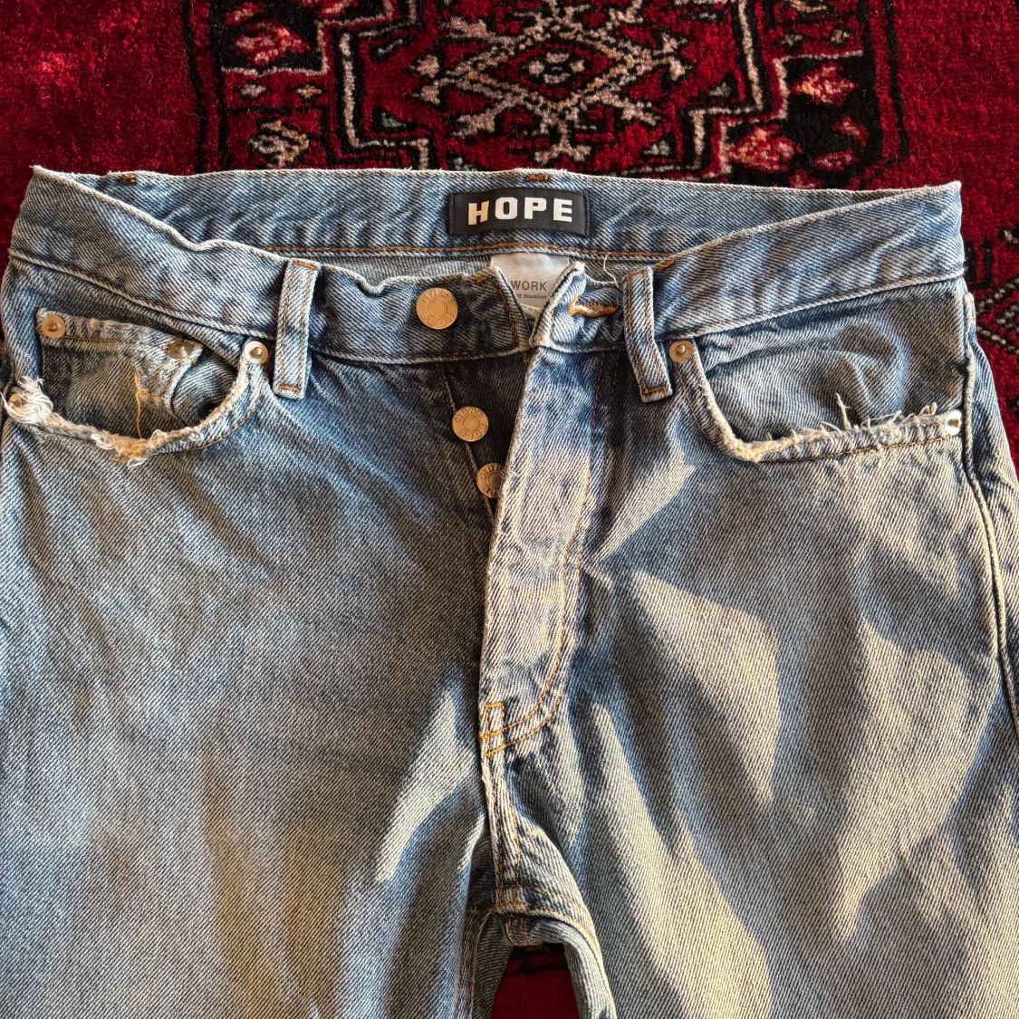 Säljer ett par klassiska ljusblå jeans från HOPE med raka ben/Bootcut och knappgylf. Jeansen har fem fickor och tydliga sömmar. Perfekta för dig som gillar en tidlös och avslappnad stil. Modell Rush, Bra skick
