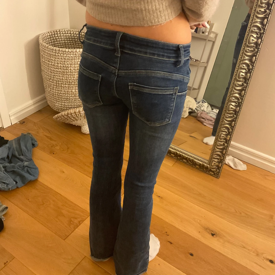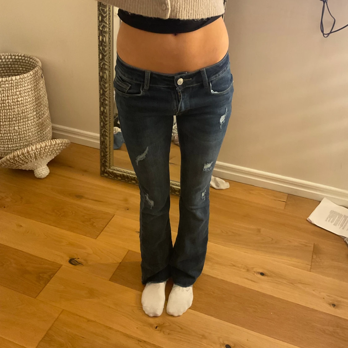 Snygga mörkblå jeans från infinity med bootcut-modell och slitna detaljer framtill. Låg midja och klassisk femficksdesign.