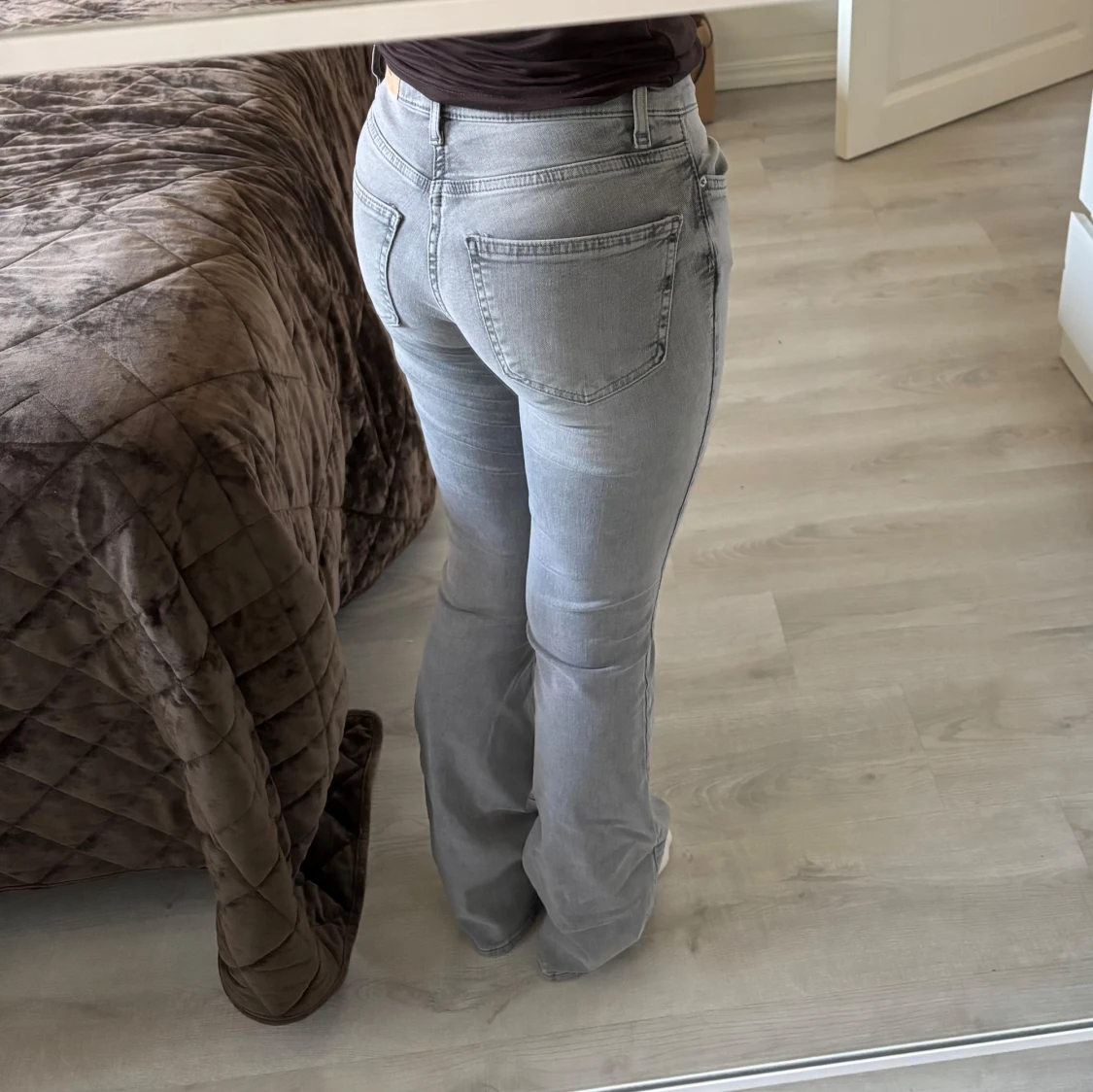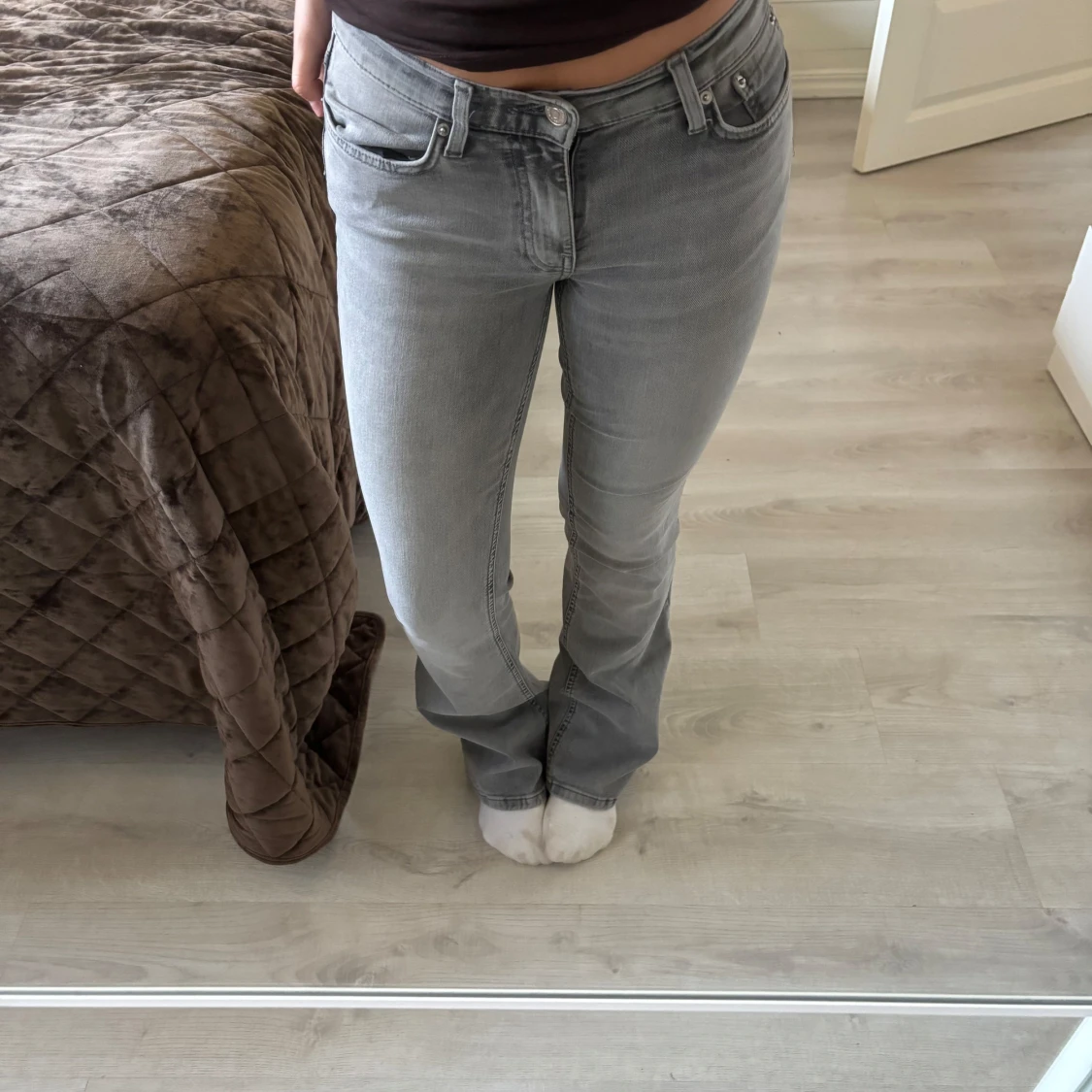 Snygga grå jeans med bootcut passform och låg midj från Gina Tricot. Jeansen har klassisk femficksdesign, bälteshällor och dragkedja med knapp framtill. Materialet är mjukt jeans och färgen är ljusgrå med lite tvättad look. Perfekta för dig som gillar retrovibbar och stilren look. Helt oanvända💕💕
